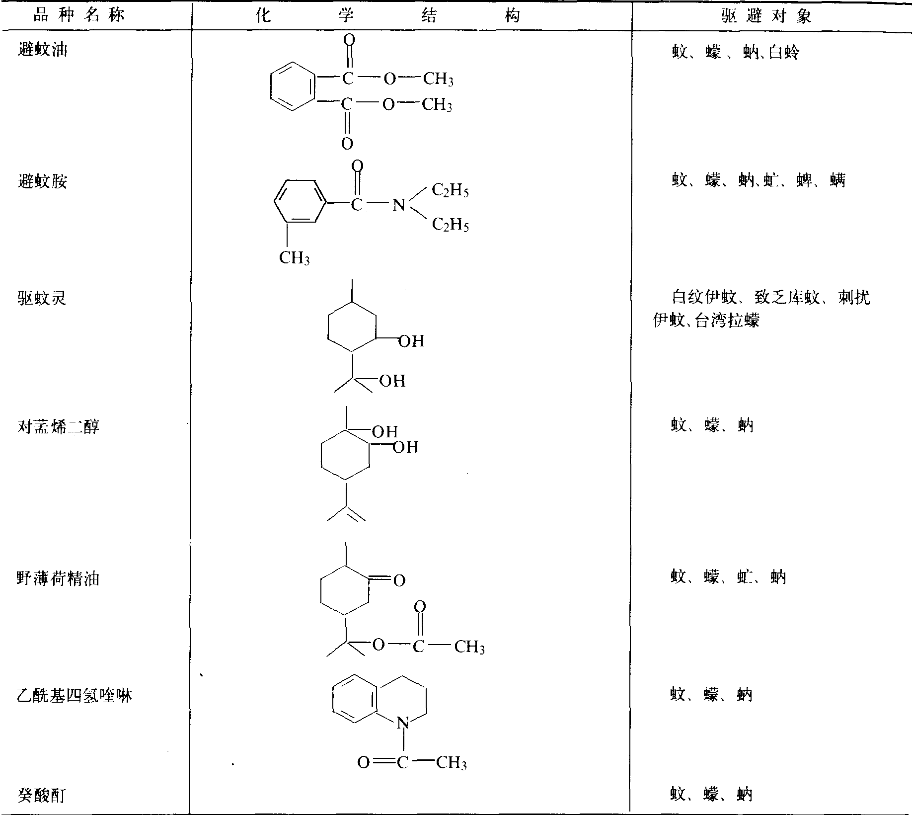 品种类型 现在实用化的都是防治卫生害虫的驱避剂,主要品种见下表。