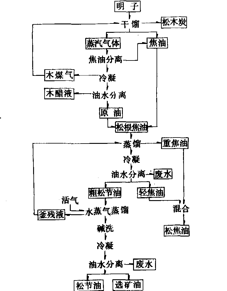 149 产品用途 松焦油是橡胶工业用的软化剂。松节油是油漆、涂料和制药工业的重要原料。选矿油用作煤炭和有色金属的浮选剂。松油是优良的防腐剂、杀虫剂,也可作淡色橡胶的软化剂。松焦油沥青可作发电厂用水输送管道的防锈涂料。 明子干馏destructive distillation of lightwood又称松根干馏。用含脂松根或含脂木材作原料,在密闭釜中隔绝空气进行热加工的工艺方法。松根含脂21%以上叫肥明子,含脂16%~20%叫中等明子,含脂13%~15%叫瘦明子。破碎成一定大小的原料盛炭笼中装入干馏釜,隔绝空气加热使分解,可以得到松根焦油、木醋液、木煤气和松木炭。松根焦油经进一步加工可制取干馏松节油、松焦油、松油等产品。松木炭可作为制造活性炭的原料。木煤气可作干馏炉的燃料。 |