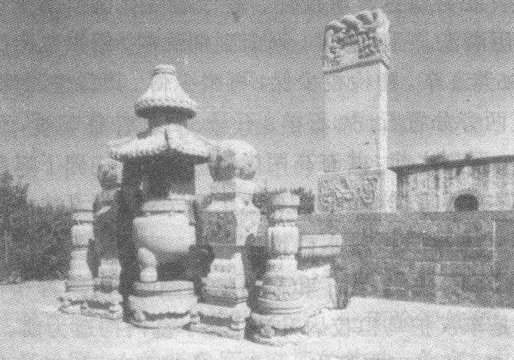 | 释义 | 明潞简王墓五供座五供座为明清陵墓建筑中的一种建筑小品。形制为石质祭祀供桌,上方香炉、烛台、花瓶。一般置于方城明楼之前。河南新乡市明代潞简王墓中五供座形式较为特别。一是香炉、烛台和花瓶体积很大,石香炉上还有重檐方亭,上檐为圆形,下檐为方形。花瓶为方形,上下分作几段,瓶上面有扁圆形石雕,上面布满了花卉和技术装饰。两边烛台也呈瘦高型。这五件石器下面各有须弥座作基座。二是这五件石器后面还有一座大型须弥座。