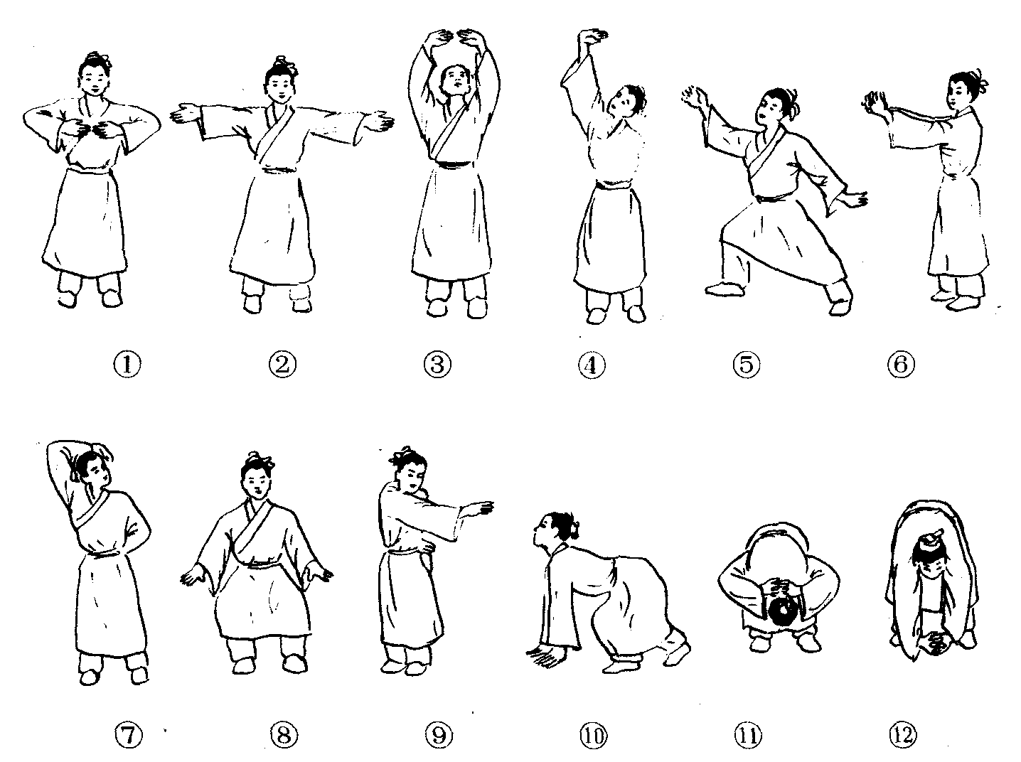 易筋经养生类著作。原题达摩祖师撰。二卷。达摩,又作菩提达磨,南天竺(今印度)人,南朝刘宋时来华,为中国禅宗初祖。所著是篇上卷首为总论,阐述易筋之含义,认为易即变化,筋即经络,人体动则气血周流。后有膜论篇,论筋联络肢骸,筋膜包贴骸骨,“护骨护筋,合为一体,以为全功”。次为内壮论,叙述揉法、采精华法、服药法、内壮药方,及外壮神勇八段锦,运刀势法等诸行功法与方药。下卷载图势和搓膀腕法、挞练手足法,炼指法等练功图说。后附录打虎状元丹、大力丸方、洗手方等方药,并任督脉图说、骨数、筋络、气血说等内容。全书搜罗较杂,主要论述气功之外功理论与方法,并与脏腑经络、气血运化等医学理论相结合,图文并茂,文辞浅近,利于普及。有道光元年(1821)原刊本,光绪二十二年(1896)刊本等约十一种刊本,诸本个别内容略有差异。 201 易筋经明末后广泛流传的导引术专书。最早流行的是天台紫凝道人伪托达摩所创的手抄本。其后祝文澜于清嘉庆十二年 (1807),傅金铨于道光三年(1823) 先后重编。这三部书都是文字说明,未作图解。1823年后出的来章氏辑本,增补了易筋经12式图象与解说。光绪二年(1876)宋光祚将来章氏辑《易筋经》与咸丰八年(1858)潘蔚编《卫生要术》合辑为《卫生易筋经》。而 《卫生要术》 则是光绪七年 (1881) 王祖源编《内功图说》祖本。同年北京同仁堂药铺又把《卫生要术》改编为《绘画易筋经》。1917、1919商务印书馆又两次印刷出版了《易筋经十二式图说》。至今易筋经仍广泛流传,在健身医疗上起到良好的作用。 易筋经养生功法之一。是以锻炼筋肉为主的一种强身保健动功功法。易筋经在历史上有多种功法,后经清代潘霨整理,载入《卫生要术》。今多施行的易筋经有十二势,依次为:韦驮献杵第一势、韦驮献杵第二势、韦驮献杵第三势、摘星换斗势、倒拽九牛尾势、出爪亮相势、九鬼拔马刀势、三盘落地势、青龙探爪势、卧虎扑食势、打躬势、掉尾势。 易筋经中国古代健身术。“易筋”意即增强筋骨。起源说法不一。流派较多,繁简各异。总的特点是动作简单、刚中有柔、多用静力、意力统一。增强体质和肌力的效果明显。古代套路有2类:其一立姿,3段22势,每势49次,多上肢动作;其二姿势多样,动作遍及全身。今已融入医疗体操。 易筋经中国古代的一种导引功法。传说为达摩所创。古人云:“筋乃人身之经络,骨节之外,肌肉之内,四肢百骸,无处非筋,无处非络,联络周身,通行血脉而为精神之外辅。如人肩之能负,手之能摄,足之能履,通身之活泼灵动者,皆筋之挺然者也。”以上所言筋在人身体中的重要性。由于筋附着在骨上,所以人们常常称之筋骨。而易筋经的主要作用,就是强筋壮骨。它的动作刚柔兼顾,动静结合,内外兼修,注重意、气、力的统一,特别对老年人更具有强身防病、益寿延年的效果。全套功法共12势。清潘霨《内功图说》等养生文献中有辑录。 ❶韦驮献杵第1式:立身期正直,环拱手当胸,气定神皆敛,心澄貌亦恭。动作过程:松静站立,形正、意正、内外如一。沉实不虚浮,静气敛神。脊柱松直,腰不可塌软,松胯,两手环抱于胸前。(图2—4—118— ❶) ❷韦驮献杵第2式:足趾抓地,两手平开,心平气静。动作过程:两脚十趾微微扣地,双手展平,掌心向上,双眼平视前方,神采内敛,耳不外闻,安泰舒展,默默呼吸。(图2—4—118— ❷) ❸韦驮献杵第3式:掌托天门目上观,足尖着地立身端,力周腿胁浑如植,咬紧牙关不放宽;舌可生津将腭抵,鼻能调息觉心安,两拳缓缓收回处,用力还将挟重看。动作过程:两掌心向上,环抱于头上顶方,并上撑如托天状,双目上视。足尖微微抓地,脚跟抬起,闭口合齿,舌抵上腭,以鼻微微呼吸。全身浑然一体,不散不懈。(图2—4—118— ❷) ❹摘星换斗:只手擎天掌覆头,更从掌内注双眸,鼻端吸气频调息,用力收回左右侔。动作过程:两足跟着地,八字分开。一手掌心向上,撑托于头顶上方;一手掌心向下,塌按于腰后。微向举手的一侧拧身,抬头目视掌心。闭口合齿,以鼻呼吸,轻轻调匀呼吸。左右手交换对称练习数次。(图2—4—118— ❹) ❺倒拽九牛尾:两腿后伸前屈,小腹运气空松;用力在于两膀,观拳须注双瞳。动作过程:两腿前后分开成弓步,前手握拳,拳眼向上,高与肩平;后手握拳向后上抬起,略高于腰,拳心向上,前后两手呼应对拉。微向前探身,目视前手拳心,气沉丹田。练习时要左右交换对称练习。(图2—4—118— ❺) ❻出爪亮翅:挺身兼怒目,推手向当前,用力收回处,功须七次全。动作过程:身体直立,目视前方,双掌平行向前缓缓推出,再渐渐握拳收回腰间,再前推。如此重复推收7次。注意向外推时要呼气,收回时吸气。(图2—4—118— ❻) ❼九鬼拔马刀:侧首弯肱,抱顶及颈,自头收回;弗嫌力猛,左右相轮,身直气静。动作过程:两脚平行站立,一手臂弯曲,掌心向前抱于头颈后,另一手臂后背,并尽力上抬。上手微扳头,使其向肘部侧靠,目视斜上方,上体保持正直,收心静气。要求左右对称轮换练习。(图2—4—118— ❼) ❽三盘落地:上腭坚撑舌,张眸意注牙,足开蹲似踞,手按猛如拿;两掌翻齐起,千筋重有加,瞪睛兼闭口,起立足无斜。动作过程:两足尖外撇,屈膝下蹲稳固站立,双手掌心向下按于腰侧,松胯挺腰,舌抵上腭,闭口合齿,双眼平视。双手翻掌向上捧起,随之起身直立。再翻掌向下塌按,还原屈膝下蹲姿势。反复起