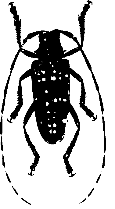 图178 星天牛 星天牛citrus trunk borerAnoplophora chinensis(Forster),又称白星天牛、银星天牛、橘星天牛。昆虫纲,鞘翅目,天牛科。分布于朝鲜半岛、缅甸、中国。寄主有苹果、梨、樱桃、李、杏、桃、柑橘、枇杷、桑及杨、柳、榆等。成虫体长19~39 mm,体漆黑而有光泽,鞘翅上生有许多小白斑,基部密布大小不等的颗粒。末龄幼虫体长45~60 mm,扁圆筒形,淡黄白色,前胸背板前方左右各有一个黄褐色飞鸟形纹,其后有一黄褐色“凸”字形斑纹。一年1代(北方2~3年1代),以幼虫在树干或树根中越冬。成虫喜在晴天、特别是中午前后活动、交配,卵多产于树干基部皮层处。幼虫蛀入木质部为害,上下左右串成隧道并充满木屑。宜采取捕杀成虫;刮除卵粒;离地面0.3~1 m的树干涂白涂剂,钩杀幼虫;药物堵塞虫孔等防治措施。 |