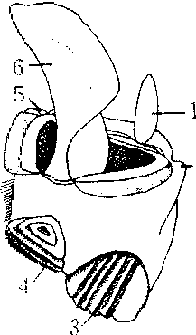 东亚飞蝗的上颚 1.展肌腱 2.关节突 3. 切齿 4.臼齿 5.关节臼 6.收肌腱 |