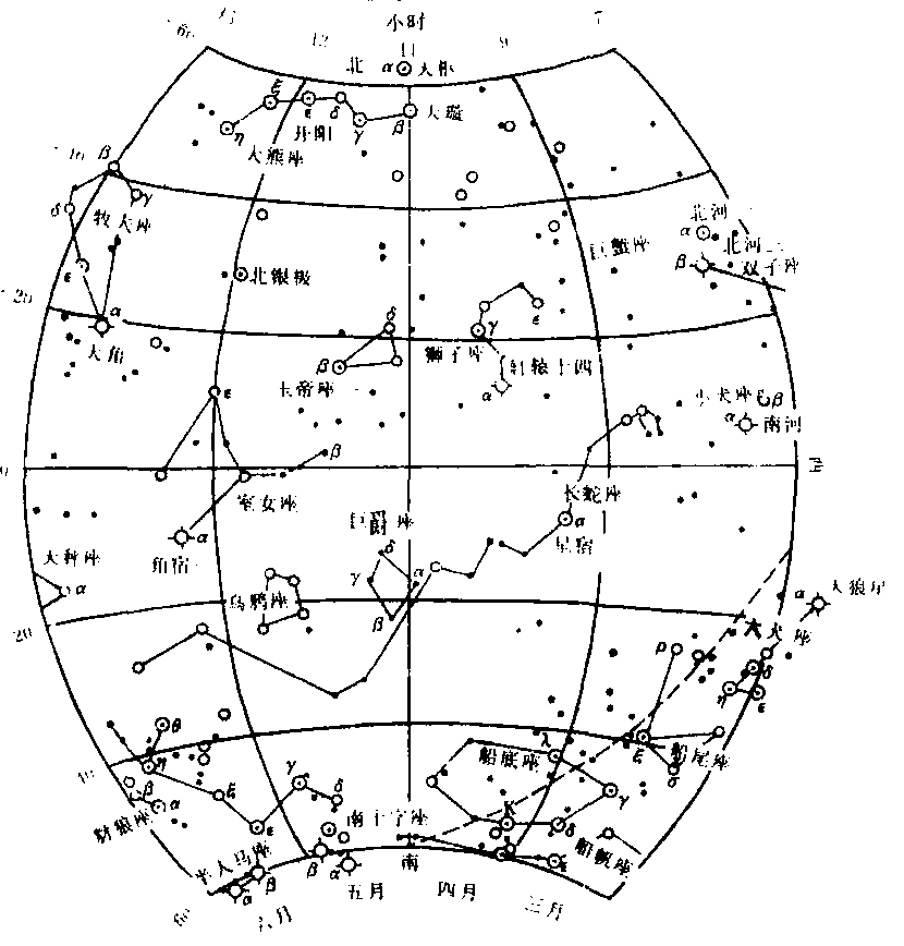 | 释义 | 春季星空Chun ji xing kong春季星空中的主要星座有大熊座、牧夫座、狮子座、室女座、长蛇座等。春季是一年中观看大熊座全星最清楚的季节。这时大熊座高悬在北天高空,北斗七星的“斗柄”指向东,这是北斗七星的春季特征。大熊座的δ、γ星连线向西南延伸,在天赤道附近有一颗白色的一等星,这就是狮子座主星α,中名“轩辕十四”。狮子座是黄道星座之一,位于天赤道以北,是一个壮丽的星座。主要亮星排列成狮子的轮廓。西部五颗星排成大镰刀的图形,象征狮子的头和前身,其下是轩辕十四,可以想象是狮子的心脏,往东有三颗2等星组成的直角三角形,它是狮子的臀部,在三角形下边的几颗小星可以想象是狮子的后腿和尾。轩辕十四是黄道上唯一的一等星。狮子座是春季的主要星座,α星距我们约84光年,其光度是太阳的150倍。顺北斗七星的“斗柄”向下延伸,就可以找到牧夫座,牧夫座α星,中名大角,是东方天空中闪着黄色光芒的一等亮星。牧夫座位天赤道以北,是北天星座之一。牧夫座的几颗亮星组成的形状很像高挂在空中的一个五边形大风筝,虽不怎么清晰,却很容易找到。牧夫座内有亮于4等的星13颗。由大角星向南,过天赤道后可以看到一颗青白色的1等亮星,这就是室女座α星,中名角宿一。角宿一也是春季夜空中的著名亮星。室女座的几颗亮星用线连起来有点像“土字”,只是其横划太弯曲。室女座α星,牧夫座α星与狮子座β星这三颗亮星构成一个近等边的大三角形,叫“春季大三角”。天球赤道正好穿过这个大三角形,它的三个顶点离天赤道都在20°以内,因此地球上广大地区都可以看到这个大三角形。由这个大三角形向北可望见北斗七星,向南可见南十字等星座。狮子座下面的长蛇座是全天最大的星座,从西南一直伸展到东南,全长102°。