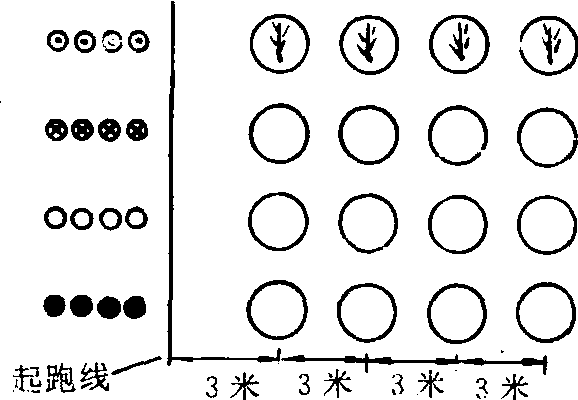 器材 小筐4个, 小沙包若干个。 场地 在操场或空地上画一条 20—30米的起跑线, 线前每隔3 米画 4—5个直径为40厘米的小圆圈。 游戏方法 把学生分成人数相等的4个队, 分别排成纵队站在起跑线后。教师发令后,各队排头学生手提小筐跑到本队前面的圆圈内,把筐内的“种子”(即小沙包)依次放在圈内,表示播种。然后绕过终点跑回将小筐交给本队第二个人,自己则站到队伍后面。第二个人提筐跑到圈内,将圈内的“种子”拾起放在筐内,表示秋收。然后跑回来将筐子交给本队第三个人,自己则站在队尾。依次往返进行,最后以先完成的队为胜。 游戏规则 ❶每个圈内只准放一个“种子”,不得放到圈外。 ❷秋收时要将所有圈内的种子都拾起来。 ❸不得在起跑线外交接小筐。 |