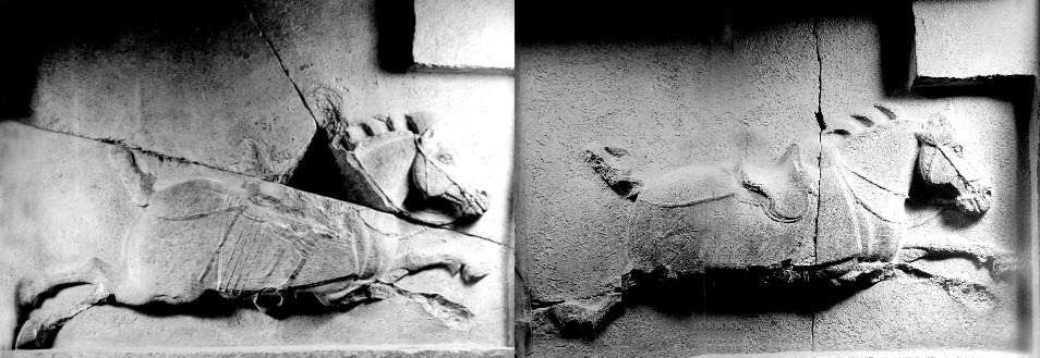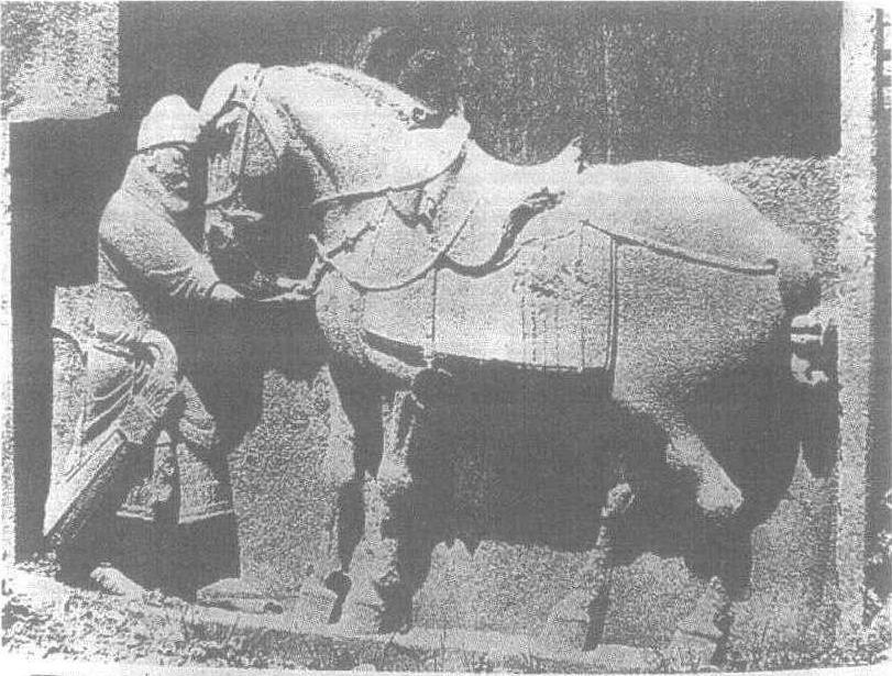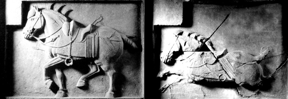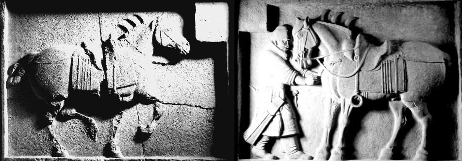 昭陵六骏 如果说汉代以马为题材的雕塑,如霍去病墓前的跃马、甘肃武威出土的马踏飞燕等注重马的宏大气势和动态描写,那么,唐代表现马的雕塑则在写实的基础上更强调马的气质和内在精神的表达。昭陵六骏,作飞奔、行进、停立三种姿势,无论形体塑造还是马的神韵的表达都十分完美。像飒露紫,这匹屡建战功的骏马,当大将军丘行恭拔出它胸中的利箭时,它的后腿,全身自然后缩,马头紧紧贴近丘行恭,表现出一种坚韧不拔的精神和对主人的感激之情。另几件,奔驰的青骓、什伐赤、白蹄乌,行进的特勒骠、拳毛䯄, 也都表现得活灵活现,仿佛能听到它们的呼吸和阵阵的嘶鸣。 昭陵六骏唐太宗李世民昭陵前的六块浮雕石刻。为太宗纪念开国武功所立。六骏为:飒露紫、拳毛騧、白蹄乌、特勤骠、青骓、什伐赤。1914年被毁。 其中飒露紫、拳毛騧被盗运出国,现存美国费城。余4块藏陕西省博物馆。 昭陵六骏zhaoling liujun礼泉县唐太宗昭陵北阙石雕。唐贞观十年(636)至永徽元年(650)前后刻。唐太宗李世民为纪念其建立大唐帝国的武功,将征战所骑六匹战马雕刻上石,立于昭陵陵后。均系石板浮雕,每块石板高2.5米,宽3米。原嵌于昭陵北阙玄武门内祭坛东西两廊上。东廊依次为特勤(勒)骠、青骓和什伐赤,西廊依次为飒露紫、拳毛䯄、白蹄乌。相传马的图样是著名画家阎立本所绘。六骏具有很高的艺术成就,简练明确的造型,圆熟浑厚的手法,栩栩如生地突出了马的性格和六骏在战阵中的不同遭遇,同时表现了初唐写实性强的艺术风格。六骏中“飒露紫”、“拳毛䯄”1914年被美国人运走,现藏美国费城宾夕法尼亚大学博物馆。其余四骏在1918年即将被盗运时因当地人阻止未遂,先存放于陕西省图书馆,后移至西安碑林。现藏西安碑林博物馆。