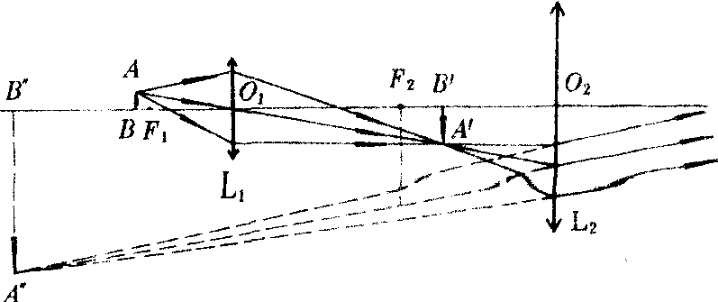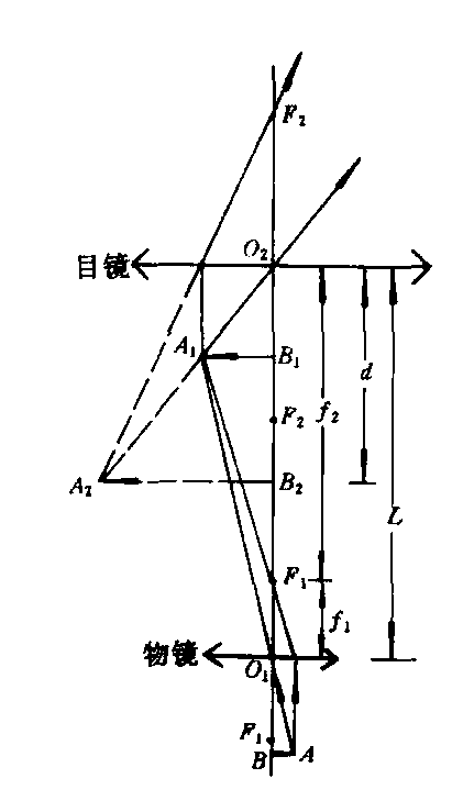 显微镜Xianweijing用来观察微小物体或物体细微部分的光学仪器。主要由一短焦距的物镜和一焦距较长的目镜组成,分别固定在金属管的两端,两镜间的距离可以调节。物镜和目镜都是由几个透镜适当配置而成的透镜组合,各相当于一个凸透镜。显微镜的成像原理如图所示。物体AB放在物镜下,位于物镜焦距以外,由物体发出的光通过物镜后成一个放大的实像A1B1,它位于目镜焦距以内,这时将A1B1看成是一个物体,根据凸透镜成像规律,光经过目镜后形成一个放大的虚像A2B2。它相对于物体AB是上下倒置、左右互换的。显微镜的放大率m=dL/f1f2,式中L为物镜到目镜的距离,d为虚像A2B2到目镜的距离,f1和f2分别为物镜和目镜的焦距。一般光学显微镜的放大率最高可达3000倍,甚至能够把物体上相距2×10-5厘米的两点分辨开。若需要进一步提高放大率,就要利用电子显微镜。电子显微镜是根据电磁原理制成的,它的放大率可高达几十万倍,能够把相距比10-5厘米更近的两点清晰地分辨开。用它可以看滤过性病毒,单个分子以及金属材料的晶格结构等。