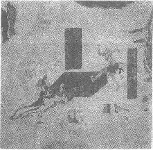 | 释义 | 晒衣故事图壁画初唐。甘肃省敦煌县莫高窟第323窟北壁西侧壁画。佛陀在池子内洗涤袈裟,而后放在晒衣石上晾晒。一外道人跑来用脚玷污晒衣石,雷神为此震怒,施威将外道击毙于地。空中天女降落,以水洗涤。图中身材干枯的外道人张牙舞爪地践踏晒衣石。石的另一端两位身披巾带的天女正在洗涤石头。右下侧有击毙于地的外道人。此图将一个故事中的几个主要情节集中于一个画面,衬景仅仅画几丛树木作点缀,人物形象尤以踏石之外道人最为生动,笔意简洁,但他的凶恶之气则表露无遗。