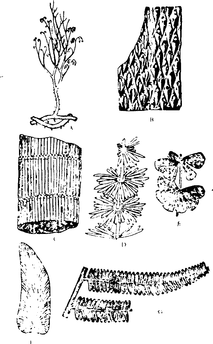 图1 晚古生代部分植物化石 A. 裸蕨; B.鳞木; C. 芦木 D.轮叶;E.楔叶; F.脉羊齿; G.栉羊齿 到了石炭二叠纪,有一种总鳍鱼类,具有坚硬的鳍,肢骨构造和两栖类极为相似,遇到干旱季节,可以在空气中呼吸,甚至可以勉强用鳍在陆上移动,再进一步演化,终于形成两栖类,所以石炭二叠纪又称为两栖类时代。动物从水中生活发展到能在陆上生活,这是动物界发展史上的又一次飞跃。1938年首次在非洲南部海中捕获残存至今的总鳍鱼类,称“拉蒂曼鱼”,又称“矛尾鱼”,成为著名的“活化石”。但两栖类毕竟不能完全脱离水体,后来出现了原始的爬行动物,能在陆上产卵和繁殖后代,为下一代爬行动物的大量繁盛准备了条件。