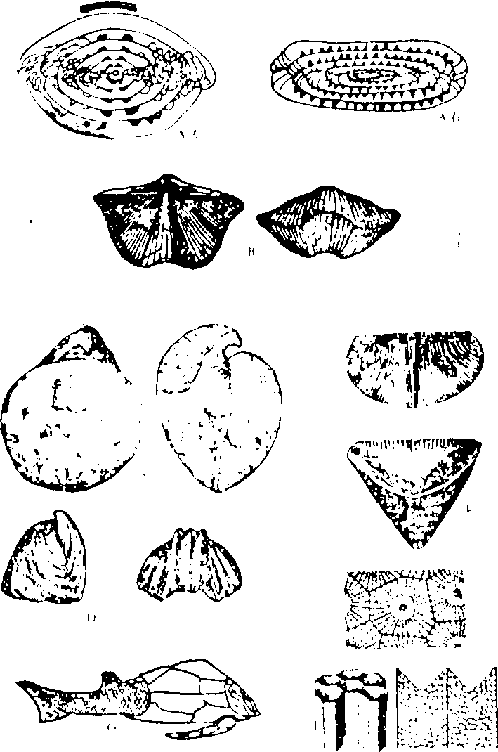 图 2 晚古生代部分动物化石 A. 两种的化石切片,左Fusulina(C2),右Pseudodoliolina (P1); B. 中国石燕 (D3); C. 颚头贝 (D2); D. 云南贝 (D3); E. 拖鞋珊瑚 (D2); F. 多角珊瑚 (D); G.一种甲胄鱼 (异甲鱼 D2) |