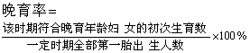 一定时期内符合晚育年龄妇女的初次生育数与全部第一胎出生人数之比。计算公式为: