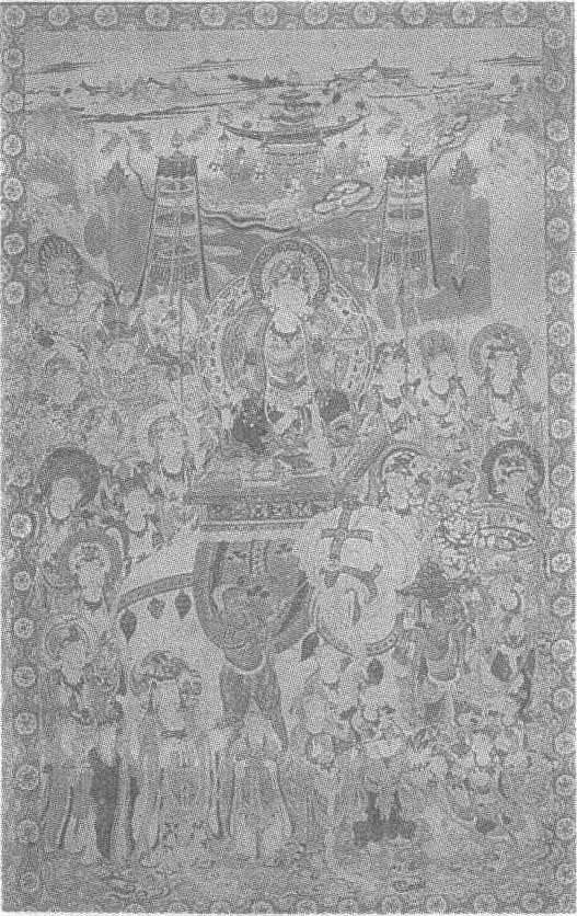 | 释义 | 普贤变图壁画中唐(吐蕃时代)。纵200厘米,横133厘米。甘肃省敦煌县莫高窟第159窟西壁龛南侧壁画。释迦牟尼的胁侍菩萨普贤乘白象侍佛之右方。图中普贤菩萨结跏趺坐于象背之上。大象身体庞大而洁白,在昆仑奴的牵引下回顾画面,其形象十分引人注目。象背高座上的普贤菩萨衣着华丽,一手托盘,头微侧,眉清目秀,神态悠然自得,四周有天龙八部、菩萨、帝释、梵天。伎乐天分持幢幡、香炉、供养花、乐器、羽扇等前呼后拥,这些人物的比例相对较小,以使普贤菩萨和所骑白象引人瞩目。画面的上端为一片山水,可能与传说普贤的道场在峨嵋山有关。此图线描挺拔,色彩雅丽,气氛热烈,是唐代莫高窟壁画中的优秀之作。