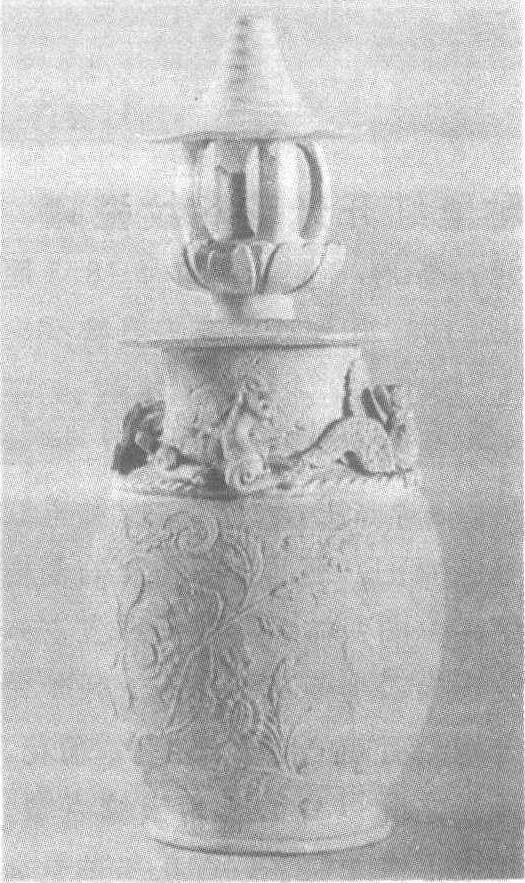 | 释义 | 景德镇窑素胎堆塑纹瓷盖罐南宋。通高35.5厘米,口径9厘米。1964年江西省景德镇湘湖南宋乾道八年(公元1172年)枢密使汪澈墓出土。江西省景德镇陶瓷馆藏。此罐是专为陪葬而制作的明器。胎质紧密,不施釉。肩部贴塑青龙、白虎、朱雀、玄武四吉祥守护神,塑造生动传神。罐腹以篦纹为地,刻画出荷花、菊花等四季花卉,纹饰清晰,线条流畅。盖钮似一朵莲花托起的凉亭,造型别致,在全器中占有重要地位。景德镇工匠高超的装饰水平和造型技艺在此可略见一斑。