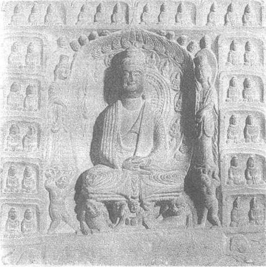 | 释义 | 景明年制石雕造像北魏景明二年(公元501年)。高58厘米,宽58厘米,厚50厘米。陕西省西安市查家寨子出土。陕西省博物馆藏。这是一座四面造像,每面主龛里均为一佛二菩萨。佛体态丰腴,面容慈祥,背光刻火焰纹、连珠纹、小佛和莲瓣纹。佛两旁各有一立于莲花座上的胁侍菩萨,莲座由力士承托着。龛楣与两侧刻千佛,下刻供养人、力士、狮子和题记等。根据题记知其造于景明二年,由清信士所造。此尊造像虽然四面构图相同,但装饰繁复多变,格调雅丽,毫无重复感,堪称北魏石刻佳作。