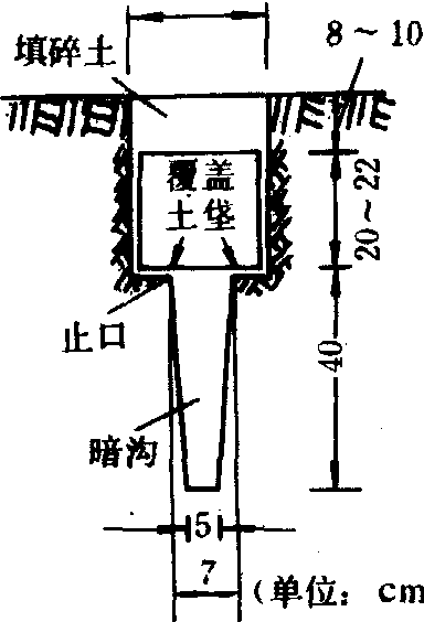 图1 暗管排水系统纵断面图 吸水管又称田间排水管,用以吸收土壤水分,降低和控制地下水位。按构造可分为暗管式、洞道式和洞道填料式三种。❶暗管式。是用不同材料做成圆形或方形的管子,埋入地下0.8~2.5米,间距10~50米,地下水通过管壁透水孔、缝或两节管接头处的缝隙进入管道,并通过排水系统排除到地段以外。为改善进水条件和防止泥沙进入管道,在管壁外或接缝处还需填加裹料或滤料。常用的暗管材料有缸瓦管、混凝土管、水泥土管、灰土管和塑料管。1967年荷兰发明由聚氯乙烯(PVC)或聚乙烯(PE)制成的波纹管,管壁薄(0.4~2.0毫米)、重量轻、强度高(比同厚度的光滑塑料管高2.5倍)、挠曲性好、耐腐蚀、抗盐碱、便于运输和机械铺管等优点,在国际上得到广泛应用。中国于70年代末开始引进波纹管生产线及埋管机械,如上海、丹东等地已能生产挖深1~2.5米的开沟铺管机。 ❷洞道式。有鼠道和盖垡土暗沟两种。鼠道是用机引鼠道犁,打在地面以下0.4~1.0米处的圆形或椭圆形孔洞,孔径6~12厘米,间距2~5米,多作田间末级排水孔道。在拖拉机或绳索牵引机牵引下,犁刀先划破土壤成铅直缝,随后扩孔器挤压土壤成洞。鼠道犁有单头和双头,根据动力的大小选用。鼠道排水适用于土质粘重地区,一般可用1~3年,最长可达10年以上,排水效果良好。它不需管材,机械施工工效高,费用低。在中国南、北方均广泛采用。盖垡土暗沟如图2所示。易施工,但使用寿命短,用工量大,多在中国南方稻区采用。在无其他地下排水措施的地方,可作为过渡性措施。 ❸洞道填料式。在沟槽下部装填碎石、砾卵石,梢捆或根茬(如玉米、向日葵根茬倒铺),其上铺秸杆、砂砾等当地材料,具有就地取材和简单易行等优点,但排水效果较差,多与暗管相配合。当表层粘性土较薄(<2米),填料暗沟揭穿表层粘性土,达到下部透水沙层时,即为渗沟。