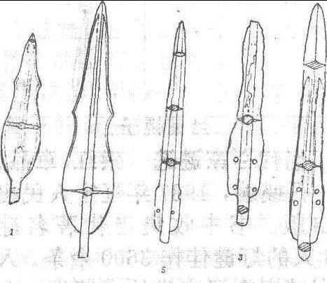 (1.永吉县星星哨出土。2.盘石县小西山出土。3.4.桦甸县西荒山出土,5.吉林市郊区长蛇山出土)曲刃短茎式铜剑