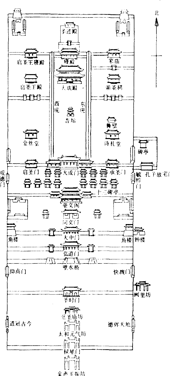 曲阜孔庙平面示意图 曲阜孔庙Qufu kongmiao古代封建王朝祭祀孔子的祠庙。位于山东曲阜县城中央。是一组具有东方建筑色彩,规模宏大,气势雄伟的古代建筑群,与北京故宫、承德避暑山庄并称为三大古建筑群。孔庙原为孔子故宅,孔子死后第二年(公元前478年),鲁哀公将其生前3间故所改建为庙。其后历代王朝不断加以扩建。现在的孔庙系明、清两代修建完成。其建筑仿皇宫之制,共分九进庭院,贯穿在一条南北长630米的中轴线上,其左右基本上作对称式的排列。中路由南向北依次有棂星门、圣时门、弘道门、大中门、同文门、奎文阁、十三御碑亭、大成门、杏坛、大成殿、寝殿、圣迹殿。从大成门起,开始出现左右两路。东路为孔子故宅,西路为祭祀孔子父母的启圣王殿及乐器库等。庙的四周筑以高墙,配有门坊角楼,黄瓦红垣,雕梁画栋,碑碣如林,古木参天。 曲阜孔庙我国现存最大的延续年代最为久远的建筑群,原址为孔子故居,东汉永兴五年(153年)由国家立庙,北宋天禧二年(1018年)大修,明弘治十七年(1504年) 重修,形成现有规模。纵长600m,宽145m,占地近10万m2,前后有八进庭院,前三进遍植柏树,穿过有金声玉振牌坊、石桥棂星门、圣时门、弘道门至大中门才到达孔庙的主体建筑群,平面呈长方形,以院墙围绕,四角设角楼,仿宫禁制度。经正门大中门、藏书楼、奎文阁到大成门,穿过碑亭院落,是孔庙的主要大殿大成殿、寝殿、圣迹殿及东庑、西庑等。大成殿规制相当于明清故宫的保和殿,面阔九间,进深五间,重檐歇山顶,覆黄色琉璃瓦,建在二层石砌台基上,大殿外10根檐柱均以石料雕成,是明代遗物,蟠龙雕刻形态浑朴,殿内楠木柱彩画富丽堂皇。中央天棚的藻井雕以蟠龙含珠,形制如太和殿,建筑的规格仅次于明清紫禁城的宫殿。大成殿祭奉孔子及颜回等十二圣贤像,寝殿供奉孔子夫人,圣迹殿陈列以孔子周游列国的石画120幅。孔庙经历朝修建,包含有各朝风格的建筑,是研究金、元、明、清官式建筑风格特征的最好实例。