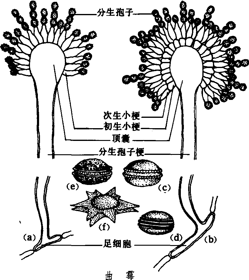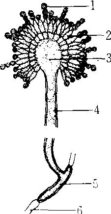 曲霉属 1. 分生孢子 2.小梗 3.顶囊 4. 分生孢子梗 5.足细胞 6. 菌丝 |