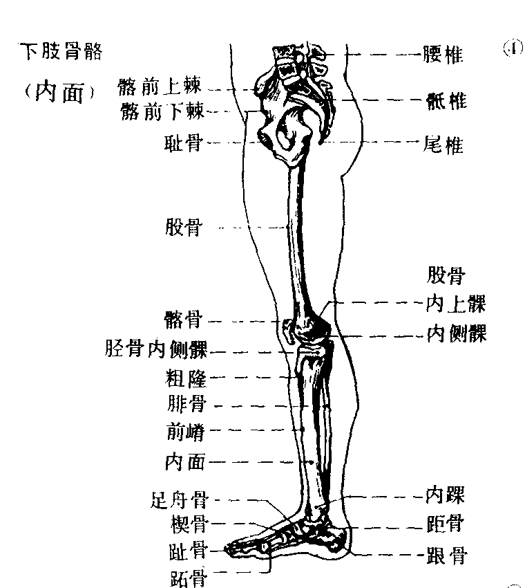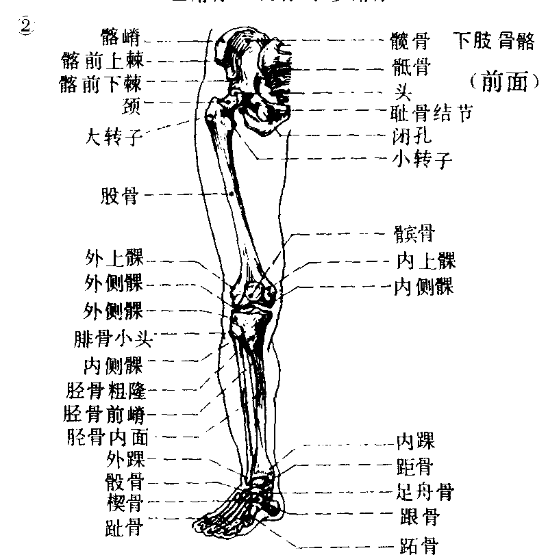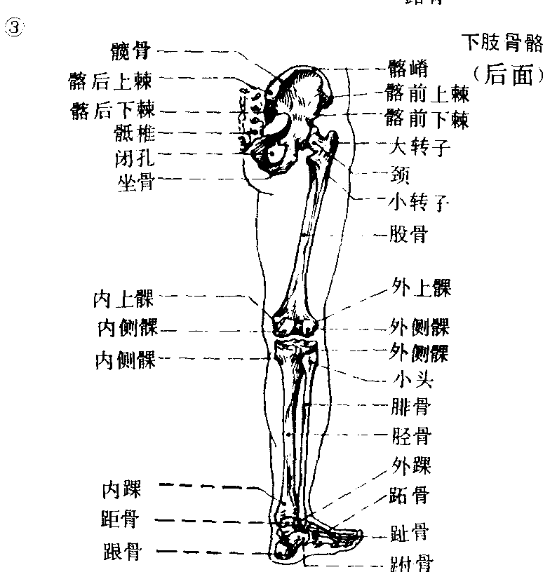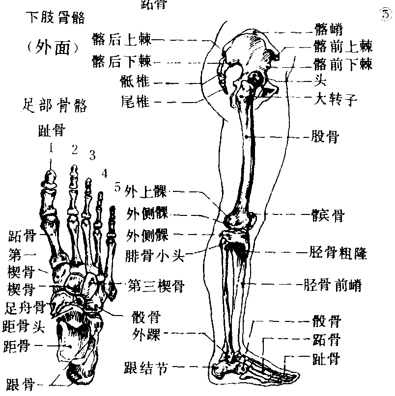 下肢骨Xiazhi gu臀部有髋骨。大腿有股骨,股骨头与髋臼相关节,此处可作多种运动; 股骨干向内斜,下端与胫骨上端相关节。膝部有明显露于皮下的髌骨。小腿有较粗的胫骨,起着支撑全身和行走的功能,外面有腓骨支撑,下端的内踝、外踝形似铗子,足骨就装在其中,形成坚固而灵活的关节。足部跗骨和跖骨构成足弓,后、外、前三处着地,内面弓形离地,足趾较短小,与各跖骨相关节 (图4 |