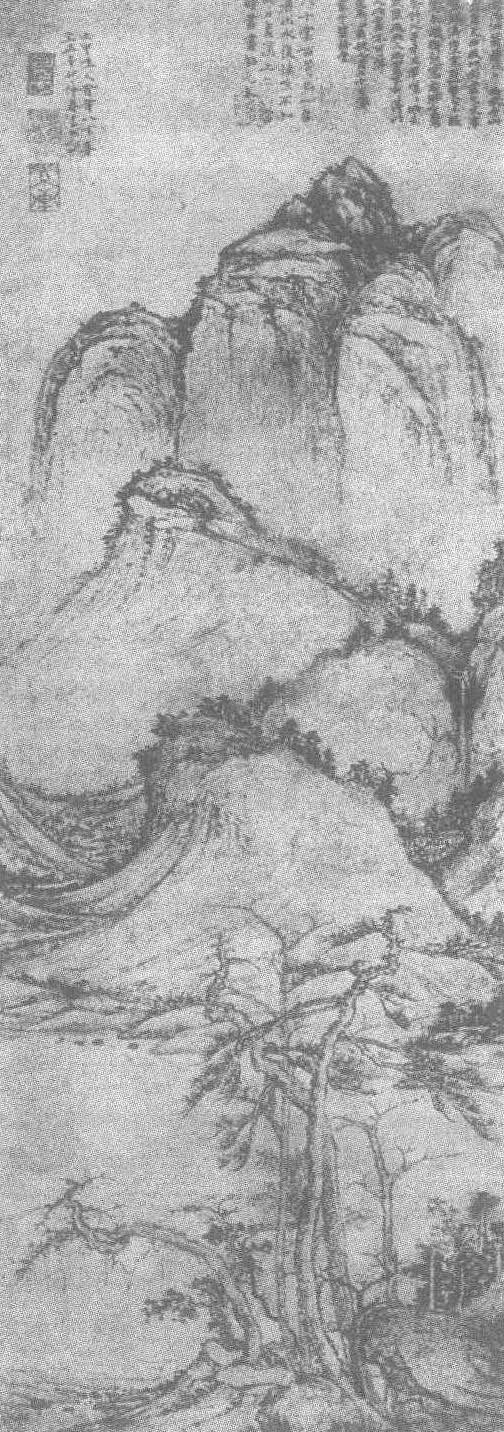 | 释义 | 曹知白疏松幽岫图轴元。曹知白绘。纸本墨笔。纵74.5厘米,横27.8厘米。北京故宫博物院藏。曹知白(公元1272—1355年),字又玄,一字贞素,号云西,华亭(今上海松江)人,至元中为昆山教谕,不久辞官归隐,擅画山水,师法李成、郭熙,笔墨清润不俗。图中数重岗岭交错起伏,山势在回转之中有节奏地抬升,山体逐渐增高、变宽,显示出浑劲厚重的质感。它的背后耸立着巍峨的雄峰,高拔险峻,但顺理成章,并不给人以突兀之感。山间轻烟微茫,飞瀑长流。杂树迷离疏落,几间屋舍依偎在群山脚下,清细的溪流回转于峰谷之间,缓缓流出山外,注入一碧湖水之中。水面开阔,波澜不惊。近岸巨石土坡之上,几株长松傲然挺立,枝干虬曲,神形苍秀。此图布局严谨,笔法简劲,线条舒展,墨色轻淡。是曹知白晚年的代表作。图中自题:“壬申生人,时年八十岁,至正辛卯仲春,云西志。”下钤〈高平郡泉氏珍藏〉等收藏印,《虚斋名画续录》著录。