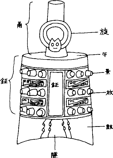 甬钟各部位名称 曾侯乙墓编钟全国重点文物保护单位擂鼓墩古墓群出土的文物。系战国早期曾国君主曾侯乙墓中的陪葬器物。1978年出土于湖北随州市,今藏湖北省博物馆。编钟包括甬钟、纽钟和一铜镈,共64件,出土时仍分三层悬于钟架。所有甬钟和纽钟都有注明音律和音阶的铭文,共2800多字,显示出我国古代乐律学高超水平。钟架呈曲尺型,铜木结构,长11米,高2.73米,黑漆彩绘。其立柱为六个青铜佩剑武士,双手与头共托木笋,奇妙绝伦。钟架十分牢固,虽承全部编钟5000多公斤重量,浸在地下水中两千余年,仍毫无损坏变形。出土后经检测试音,其音阶准确,音域宽广,音色优美,结构与今通用的C大调七声音阶同一音列,共含5个八度又一大二度,其中心音域的3个半八度、12个半音齐备,不但可旋宫转调,而且可演奏现代和声与复调手法的多声部乐曲,令人惊叹不已,实为世界音乐史上之奇迹。 |