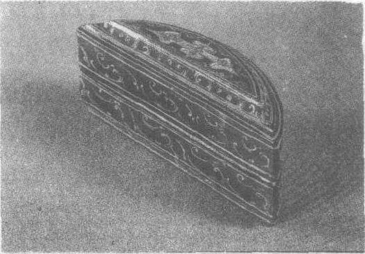 汉。长12.2厘米,半径4厘米,高6厘米。1975年安徽省天长县汉墓出土。安徽省博物馆藏。夹纻胎,近似半圆形,双层。里髹朱漆,表面黑漆底上,遍绘红色勾云纹和几何纹,并在盖面中心用银片镶嵌一朵柿蒂形花纹。此盒形如新月,清瘦秀美,是别具一格的汉代漆器。