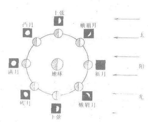 ❷月球在绕地球公转的同时,还随地球绕太阳运动。日、地、月三者相对位置的改变,产生了不同的月相。月相更替具有周期性,其平均周期为29.53日,即一个朔望月。月相随月球与太阳之间黄径差由0°——360°的变化而相应地出现新月(朔)、峨眉月、上弦、凸月、满月(望)、残月、下弦,再回到峨眉月和新月的变化(见图)。月球与地球相合,即两者黄经差为0°时,出现新月(朔)。此时,月球黑暗面朝向地球,地球上基本看不到月亮。朔通常在我国农历初一。新月与太阳同出同没。月球与太阳黄经差为45°时,出现峨眉月。此时,地球上观看到的月球明亮部分呈峨眉状。峨眉月在农历的初三、四;月球与太阳黄经差为90°时,地球上观看到的月亮黑暗与光亮部分大致相等,呈弓弦状,称上弦月。农历每月初八、九可看到上弦月。上弦月比太阳出没落后1/4日;月球和太阳黄经差达135°时,出现凸月。地球上可看到大部分月面明亮。此时在农历初十二左右。凸月比太阳出没迟3/8日,故大部分时间出现在夜间;月球和太阳相冲,即两者黄经差为180°时,出现满月(望)。此时为农历初十五、十六。望与太阳的出没正好相差1/2日。太阳西落,满月东出;太阳东升,满月西落。月球与太阳黄经差由180°增至360°过程中,地球上可看到的月球光亮面由大渐小,月相变化与上面相反,经历残月、下弦、蛾眉月,再回到新月。至此月相结束一个周期变化,历时一个朔望月。月相变化极易观察,周期性显著,是制定历法的依据。