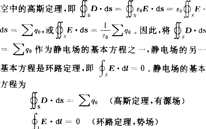 E·ds=1/ε0Σqi,式中Σqi为闭曲面内所包围的一切电荷,当介质存在时,Σqi应包括自由电荷和极化电荷。要由电荷分布求场强E,必须同时知道自由电荷及极化电荷,而极化电荷是由场强E而形成的,这就似乎形成了计算上的循环。引入辅助量D=ε0E+p(=ε0εrE=εE)就可以使高斯定理方程中不出现极化电荷,成为有介质存在时的高斯定理。真空条件下D=ε0E,又不存在极化电荷,即仅有自由电荷,这时有介质时的高斯定理就变成了真![]() D=ε0εrE(物质的介质方程)在自由电荷和介质分布具有某些对称性的条件下,由 D·ds=Σq0可求得电位移D的分布,由E=1/ε0εrD可求得电场E的分布。 |