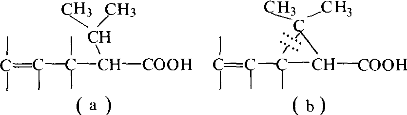 上述品种的分子结构中都有除虫菊素分子中的活性结构部分(图2除虫菊素分子结构式中的虚线方框内),唯一的例外是氰戊菊酯。但是如果把它分子中酸部分(图4虚线框内)的苯环切去2/3,并写成下列一个式子(图5a),再把菊酸分子中环丙烷结构的一边切开(图5b)进行比较,可以看出两者仍具有一个共同结构。