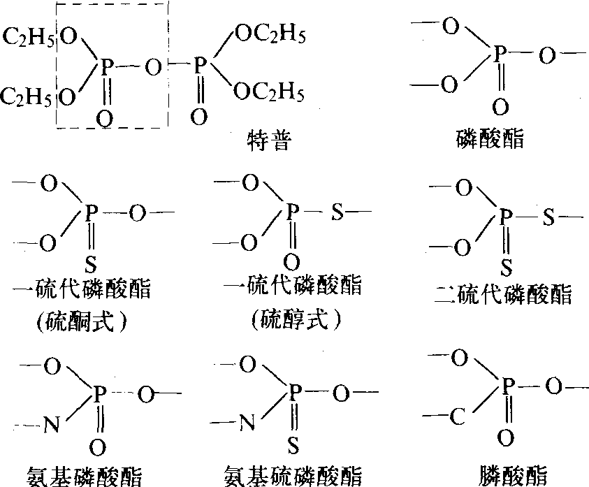 有机磷农药的发展道路比较平坦顺利。1938年施拉德合成了TEPP,并证明它对人及昆虫都有很高的毒性。十多年之后,多种有机磷农药已成为商品,形成了农药中的一个大类。其活性结构的线索是磷酸酯基团(图1),即TEPP分子中虚线方框中的部分。在