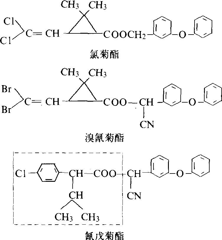 进一步改变为二苯醚,又引入一个氰基,之后,这种菊酯的药效又提高了几倍。在1973年后,陆续出现了氯菊酯、溴氰菊酯及氰戊菊酯等多种光稳定菊酯(图4),而成为有机合成农药中的一个大类。可以注意到,