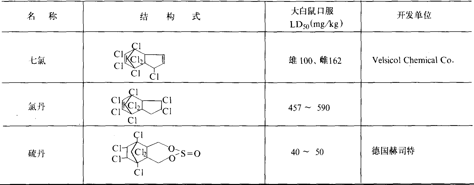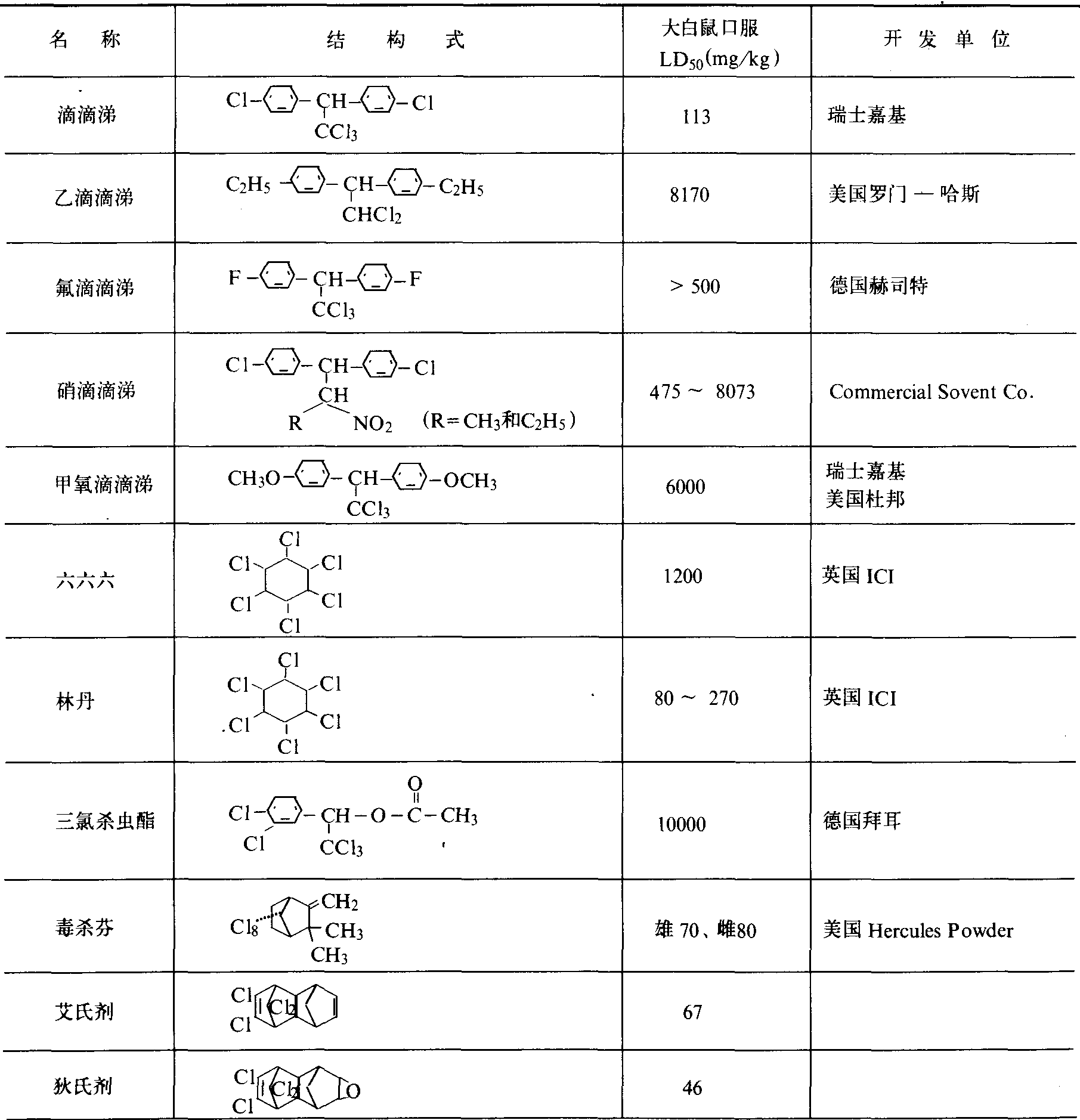 20世纪40年代后期到50年代初期是有机氯杀虫剂大发展时期。这期间开发的类似DDT品种有:乙DDT(pherthane)、氟DDT(DFDT),硝DDT(dilan)、甲氧DDT(methoxy chlor)等。但其使用的范围和吨位,都远不如DDT,而其稳定性都较滴滴涕差,速效性较快,残效性较短,对环境污染轻。同期出现的重要品种还有以松节油为原料的毒杀芬,以环戊二烯为原料的艾氏剂、异艾氏剂(isodrin)、狄氏剂、异狄氏剂(endrin),七氯(heptachlor)、氯丹(chlordane)、硫丹等都曾在世界范围内广泛使用。由于大多数有机氯杀虫剂活性稳定,大量广泛应用后,也产生了一系列问题,如造成环境污染、破坏生态平衡,以及通过生物链浓缩,对人畜可能产生慢性中毒,甚至进入人奶或牛奶中,对婴儿的健康造成潜在危害。因此早在1963年美国卡森(Rachel Carson)女士,在她的《寂静的春天》一书中就提出了警告。尽管对有机氯杀虫剂的致突变、致畸、致癌作用,还有不同看法,但出于对人体健康的高度重视,对改善环境生态的强烈愿望1970年前后,许多国家都颁布了禁用或限制使用有机氯杀虫剂的规定。只有少数品种,如甲氧滴滴涕、三氯杀虫酯(acetofenate)等,不污染环境,没有累积毒性,还在广泛应用。