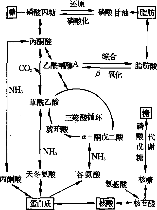 主要有机物间的代谢关系 糖、脂类、蛋白质、核酸等四类生物大分子,各有其复杂的代谢转化过程,但又相互联系、相互制约,并以糖类代谢为枢纽把几类物质的代谢沟通起来,共同组成一个完整的代谢网络。如糖氧化分解所形成的各种酮酸 (丙酮酸、α-酮戊二酸、草酰乙酸)可以通过氨基化和氨基转移作用,形成氨基酸,进一步再合成为蛋白质; 同时蛋白质也可降解为氨基酸,然后再转变为糖。糖酵解过程所产生的磷酸丙糖可转变为α-甘油磷酸,所产生的丙酮酸经氧化脱羧转变为乙酰辅酶A,再转变为脂肪酰辅酶A,然后与α-甘油磷酸缩合形成脂肪。同时,脂肪分子中的α-甘油磷酸也可转变为磷酸丙糖,再沿酵解过程的逆转而形成糖; 并且脂肪酸也可经β-氧化形成乙酰辅酶A,后者经三羧酸循环形成草酰乙酸,草酰乙酸脱羧形成丙酮酸,再沿糖酵解过程的逆转形成糖。由于糖与蛋白质、糖与脂肪可以互相转变,因此,通过代谢网络可将糖-脂肪-蛋白质之间的转变互相沟通起来。再如,糖代谢的磷酸戊糖途径可以产生核糖,氨基酸和其他代谢产物组成的碱基(嘌呤、嘧啶)与核糖结合而形成核苷酸,再聚合成多核苷酸即核酸。可见,核酸代谢与糖代谢和氨基酸代谢也有密切的关系(见图)。