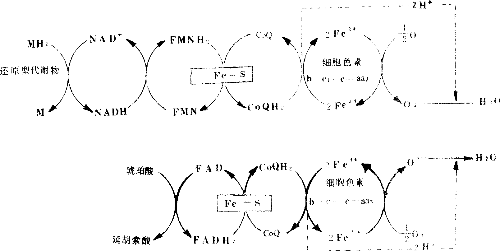 ![]() Fe2+。这类蛋白质在线粒体内膜上,常和黄素脱氢酶或细胞色素结合成复合物。在从NADH到氧的呼吸链中,有多个不同的铁硫中心,有的在NADH脱氢酶中,有的和细胞色素b及c1有关。辅酶Q是 一种脂溶性