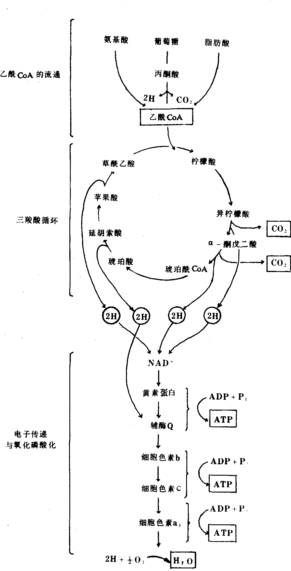 图519 有氧呼吸流程图(方框内为终产物) 醌类化合物,因广泛存在于生物界故又名泛醌。其分子中的苯醌结构能可逆地加氢还原成对苯二酚衍生物,在呼吸链中起中间传递体的作用。细胞色素是一类以铁卟啉(与血红素的结构类似)为辅基的红色或棕色蛋白质,在呼吸链中依靠铁的化合价变化而传递电子:有氧呼吸见呼吸作用。 有氧呼吸见“生物学一般”中的“有氧呼吸”。 有氧呼吸生活细胞在分子氧参与下,把某些有机物氧化分解,形成二氧化碳和水,同时释放能量的过程。其反应式为:C6H12O6+6H2O+6O2=6CO2+12H2O+能量(686千卡)。是高等植物呼吸的主要形式。参见“微生物”中的“有氧呼吸”。 有氧呼吸在以有机物质为基质的生物氧化反应中,以分子氧作为最终电子受体的呼吸类型。许多微生物依靠这一过程获得生命活动所需的能量。 有氧呼吸aerobic respiration见“呼吸作用”。 |