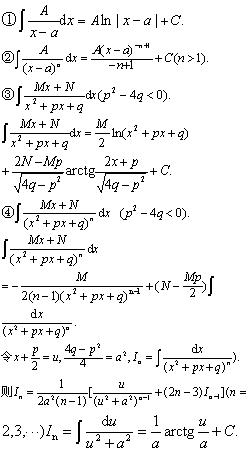 借助多项式除法可将有理函数的不定积分化为多项式的不定积分和真分式的不定积分,而将真分式分解为部分分式后,其不定积分可以化为下列四类分式的不定积分由于以上四类不定积分都可求出,并且表成初等函数,所以,一切有理函数的不定积分都可以表示成初等函数,这些初等函数仅包含多项式,真分式、对数函数和反正切函数。