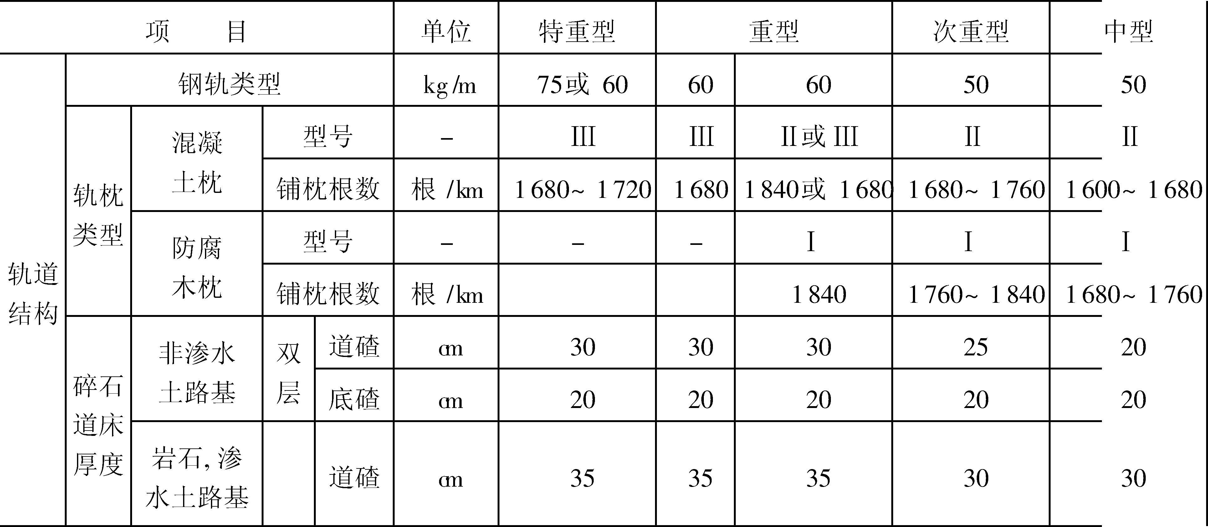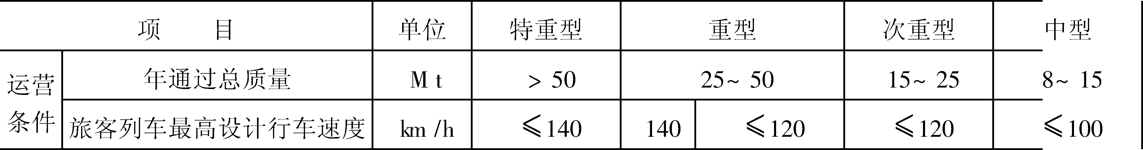注: ❶ 正线轨道类型应按照由轻到重逐步加强的原则,根据近期调查运量及旅客列车最高设计行车速度等主要运营条件按上表的规定选用。 ❷ 年通过总质量应包括净客货运量、机车和车辆的质量,单线按往复通过总质量计算,双线应按一条线的通过总质量计算。 |
