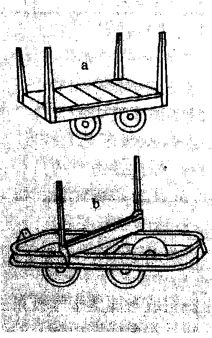 | 释义 | 有轨运材车logging truck用于装运原木、锯材及其他成件物品的有轨车辆。在木材加工企业中,原木、锯材或所生产的木制品、木材加工碎料等,都可以应用有轨运输;在木材干燥车间中,中国绝大部分都是采用有轨运输。有轨运输车辆的种类较多,按车辆的驱动方式可分为人力推动和机械牵引两种;按牵引动力可分为电动和内燃机驱动两种。有轨运输的轨道可以分布到厂内或车间内所需要的各个地方。铺设轨道所用钢轨的型号以每米长度的钢轨重量(千克数)来表示。厂内有轨运输一般采用8、11、15、18(千克/米)等几种轻型钢轨。中国铁路的标准轨距为1 435毫米,厂内运输的轨道通常称为窄轨,窄轨轨距有600、762、900毫米3种,应用较多的窄轨轨距是600、762毫米两种。有轨小车(见图),通常做成四轮平车。在车架的两侧装有固定的或活动的立柱,以便堆装木材。若将车体加装箱板或做成斗状,就可以用来装运散粒状物料或小件物品。运输量不大、运输距离较短的有轨小车,由人力推动。当运输量、大运输距离较长时,可将多台小车串联起来,用机车牵引即为成列运输。有轨小车常用在木材干燥室中堆装需要进行干燥的板材,若用于运输长材或其他特长物品时,可用两个或多个小车在轨道上纵向排列起来,组成多节平车,将长材纵向放置其上进行运输。窄轨机车是厂内运输的牵引动力,供调车或作车辆牵引。按动力形式可分为内燃机车、电力机车、蒸汽机车,后者在厂内运输中已很少使用。窄轨内燃机车是用柴油机作动力,已定型生产的机车功率为15~279千瓦,其中一部分中小功率机车用于厂内运输作牵引动力,也有利用汽车、拖拉机的发动机为动力装置制成简易式内燃机车。窄轨电力机车以电动机为动力,根据供电形式分为架线式和蓄电池式,后者只适用于小型机车。电力机车一般采用牵引直流串激电动机,电动机启动转矩大,对电网电压影响小,适合于重载启动。电力机车与内燃机车相比较,优点是启动力矩大,操作简单,运行中无噪音、无废气。缺点是一次投资大,需架设供电线路及设置相应的变电站(或备用蓄电池组)。窄轨机车只用在较大型的贮木场及木材厂中,运输量大、运输距离远时使用。