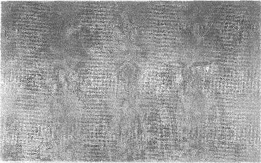 | 释义 | 朝元图(部分)壁画元。纵239厘米,横517厘米。陕西省跃县南庵四帝殿西壁壁画。此画面为朝元图的中心部分,前排是白玉龟台九灵太真金母元君、中天紫微北极大帝和昊天金阙至尊玉皇大帝。金母元君头戴凤冠,背后有圆形头光,着绿色大袍。两位大帝头戴冕旒,分着绿色和红色大袍,一副人间帝王的装束。他们双手捧圭置于胸前,站姿威风,颇具气派,显示出帝后的尊贵和威严。身后有两位玉女相随,一位手持团扇,一位端供盘,姿态婉丽,缓步而行。此图设色以绿、红、蓝为主,画技娴熟,笔触淋漓,将帝后的威慑力很好地烘托了出来。