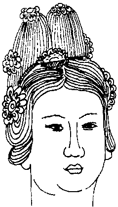 朝天髻 朝天髻古代妇女梳用的高髻的一种。始于五代十国的后蜀。流行于两宋的宫廷和仕宦之家的贵族妇女中。据 《宋史·五行志》 载:“建隆初,蜀孟昶末年,妇女竟治发为高髻,号朝天髻。” 其发式为梳发于顶,编成两个圆柱型发髻,然后将发髻朝前反搭,前低后高,伸向前额,并在髻下饰以各种簪钗。发髻前端在头顶高高翘起,有朝天之状,谓“朝天髻”。