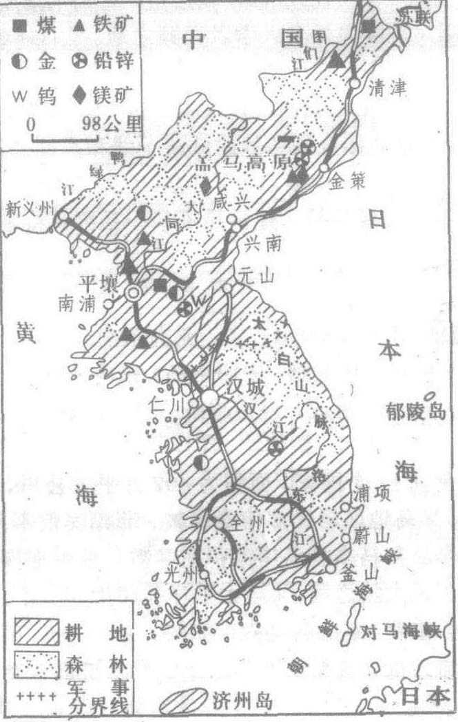 | 释义 | 朝鲜Chaoxian全境由朝鲜半岛和周围3300多个岛屿组成,面积22.2万平方公里。国土狭长,东西最宽仅360公里,南北长840公里,素有“三千里锦绣江山”(按朝鲜里)之称。国土三面环水,北靠大陆,南临朝鲜海峡,扼东北亚与东南亚海上交通的要冲,地理位置重要。地貌以山地、高原为主,约占全境3/4。地势东北高,西南低。北部的盖马高原有朝鲜“屋顶”之称。高原周围被山地环绕。东部为海拔1000米左右的太白山脉,南北绵延450多公里,山脉东坡陡峭,西坡平缓,逐渐过渡成海拔500米以下的丘陵。西部和南部沿海为平原。多短小流急的河流,上游富水能资源,下游有灌溉之利。为温带季风气候。北部大陆性较明显,向南海洋性逐渐显著。全国大部分地区降水不足1000毫米,2/3降水量集中于夏季。矿产资源丰富,有煤、铁、菱镁矿、钨、金、银、铅、锌、石墨、钼等多种矿藏。森林覆盖率达70%以上。朝鲜人口6300万,其中2080.8万居住在北部。由单一的朝鲜族构成。 朝鲜Chaoxian位于朝鲜半岛,三面环海,背依大陆,以鸭绿江、图们江与我国、俄罗斯为界。面积22万平方公里,领土狭长,南北长2 100朝鲜里,东西960朝鲜里,素有“三千里锦绣江山”之称。人口约6 449.6万,北部2 190.3万,南部4 259.3万,由单一的朝鲜族构成。地形北部、东部高,向西、南倾斜。北有盖马高原,东为太白山脉。太白山脉北段的金刚山峰峦叠嶂,瀑布飞流,是著名游览胜地。西部和南部沿海以平原为主,是主要粮食产地。河流多发源于北部和东部的高原、山地,注入黄海。河流短,上游坡陡流急,水力资源丰富。北部边境河流鸭绿江和图们江已建有大小电站多处。属温带季风气候,但具有明显的过渡性,气温的年较差比同纬度东亚大陆地区小,降水量也较丰富,越向北越接近东亚大陆的气候。矿产资源丰富,金、钨、石墨、铁、煤、铅、锌、铜、菱镁矿等都很丰富。森林覆盖率达73%,林木资源丰富。矿产及用材林主要集中在北部。朝鲜是个历史悠久的文明古国。本世纪初沦为日本殖民地,第二次世界大战后获得独立。但是,美国军队进驻北纬38°线以南,将其分为南北两部分。北部工农业迅速发展,现已形成以重工业为主体的工业体系。采矿、电子、冶金、机械制造和化学工业是主要工业部门。工业集中在西部和东部沿海。西部以平壤和南浦为中心,主要有冶金、机械制造、建材、化学、纺织等轻、重工业部门。东部的咸兴、元山、金策、清津等城市,多为深水不冻港,又有煤、铁、木材等资源,发展为冶金、机械制造、化工等重工业部门为主的沿海工业区。农业以种植水稻、玉米等粮食为主。甜菜、亚麻、烟草是主要经济作物,“高丽参”同我国人参在世界齐名。果树种植、家禽养殖发展较快。战后,南部经济也得到迅速发展,钢铁、船舶、汽车、石油化工、电子等工业已成为主导工业部门,纺织品,成衣等轻工产品亦可大量出口。以汉城、仁川为中心是南部主要工业中心,纺织、服装、食品、机械、化工为主要工业部门。釜山、蔚山、浦项等城市构成另一工业区。南部原是朝鲜的“粮仓”,因优先发展工业,忽视农业,导致粮食自给率下降。耕地一半以上种植水稻,还有小麦和杂粮。平壤是朝鲜民主主义人民共和国的政治、经济、文化、交通中心,汉城是全国最大城市。现南北双方都为祖国的统一而努力。