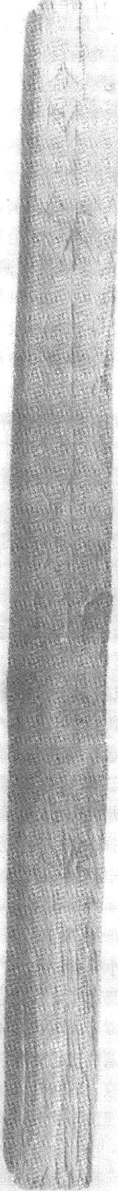 木尺度具。1976年广西贵县罗泊湾一号墓出土。杉木板制。长条形,正面刻出十等分,正中处刻交叉十字,刻槽内填红漆,每一刻度相当于一寸,实测长2.3厘米。全尺长23厘米。与汉廷颁行的标准度具长度相当,表明汉初广西越族度制与中央相统一。 |