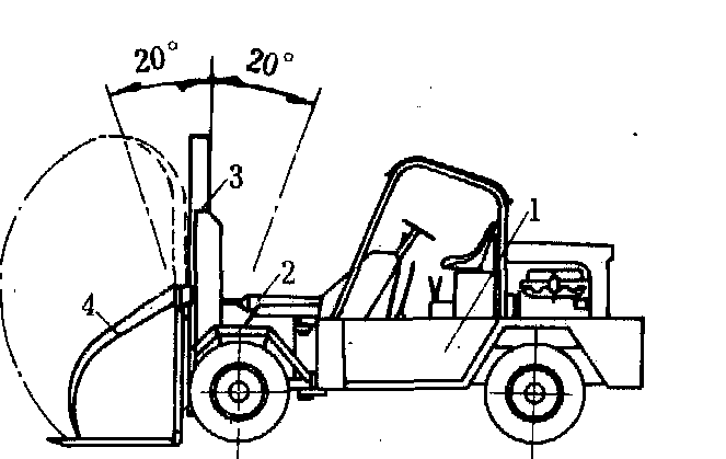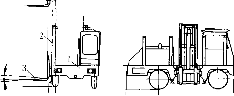 图2 侧面木材叉车 ❷侧面木材叉车:在平台式车架的一边布置司机室、发动机和门架支承装置。平台中段有开口槽,槽内两侧铺轨道,门架被油缸经链条牵引,能沿槽轨往复移动。当门架抵达车体外侧位置时,放下油压千斤顶支脚,协助支承车架,利用叉架铲取木材。装满木材后,操纵起升油缸顶起内门架,同时经两组链轮和链条将叉架沿内门架上升,随后操纵横移油缸,缩回门架,将木材搁置平台上。收缩支脚后即可行驶。侧面叉车的行走系统与汽车类似,但发动机偏置在车体一边。从发动机引出的动力经离合器或液力变矩器、变速箱、链传动箱传递到车架下面的双万向节后,再经驱动桥、半轴与轮边减速装置,使车轮旋转。侧面叉车采用后轮驱动和前轮转向。转向系统配备液压助力器或全液压的双油缸或动力转向。 性能 标志叉车主要性能的是额定起重量,即标准载荷中心处加载时的允许载重量。在林业上,木材叉车额定起重量一般为3吨及5吨,起升高度3~4米;门架前倾角5°~10°,后倾角相同或略大些,正面式的最大前后倾角可达20°,车轮外侧转弯半径3~5米;行驶速度可达20~30公里/小时以上;爬坡能力约20°。在产品型号中,字符CZ表示正面叉车,CC表示侧面叉车,后随数字表示额定起重量(吨),如CC5标志额定起重量5吨的侧面叉车。 发展趋势 20世纪80年代普遍注重叉车的多用性,如作为工作属具的叉架可以改为长形悬梁式吊架,以提升特长的原条或长形建筑木料;又如门架机构制成可旋转90°的正、侧面综合式,兼备正面叉车和侧面叉车两者的优点,机动性能好,适应在车间、仓库或沿狭隘通道上搬运长材。起重量10吨以下的侧面叉车在车架与支承轮轴间采取弹簧、橡胶块、缓冲油缸等组成的四点悬置系统,从而取消液压千斤顶式支脚,仍能保持叉车稳定性。这时需采取箱形截面钢材和受扭力的管形主梁结构组合式车架,以承受因缺少支脚而引起的剧烈应力。考虑工作舒适性,司机室采取减振的橡胶悬置设施和隔音墙板,建立安全防护钢架,周围镶大型玻璃以扩大工作能见度。大吨位级,如20吨到50吨起重量的叉车正在发展,以求装卸作业的最佳经济效益。 |