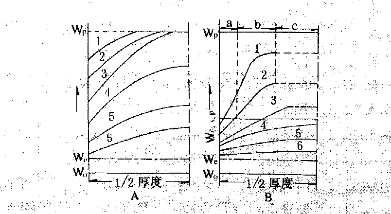 当木材含水率高于纤维饱和点时,水分移动的原动力与含水率梯度无关。因为尽管自由水含量在不同部位上可能不同, 但在木材整个厚度上都含有自由水(见木材含水量), 水蒸气压力到处都是一致的, 不存在水分以蒸汽状态发生移动。同时由于细胞壁充满水分, 微毛细管尺寸到处都是 一样, 也不存在吸着水以液态沿着微毛细管移动。此时唯有自由水可以在外力作用下沿着大毛细管移动。但是如果将含水率高于纤维饱和点的木材进行干燥, 其表层水分由于蒸发很快降低到纤维饱和点则将出现完全不同的情形, 此时表层微毛细管最大直径将比含有自由水的内部小, 结果就在表层与内部之间产生毛细管张力差。此种毛细管张力差促使自由水从木材内部向表层(蒸发自由水表面)移动。随着木材干燥过程的继续进行, 上述自由水蒸发面将逐渐移至木材内部, 并沿着整个木材从内到外形成三个区域: ❶扩散区域(图Ba), 在此区域中含水率低于纤维饱和点, 吸着水的移动速度决定于含水率梯度和导湿系数;