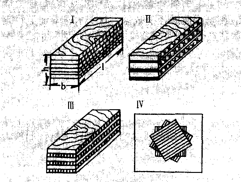 各品种木材层积塑料结构图 性能 木材层积塑料的物理力学性能不仅超过天然木材和胶合板,某些性能甚至优于金属。木材层积塑料的制造原理是利用木材具有塑性和用化学、机械、热力处理使其具有高的物理力学性能和尺寸稳定性。木材层积塑料的质量与强度取决于以下因素:单板厚度、单板含水率、相邻层纤维方向、浸渍单板树脂含量、加压压力、温度和加压时间。用作木材层积塑料的主要材种有桦木、山毛榉、色木、荷木、杨木等。浸渍树脂可用水溶性或醇溶性的酚醛树脂或甲酚甲醛树脂、环氧树脂、聚酯树脂等。 生产工艺 木材层积塑料的主要生产工艺:将0.5毫米厚度的单板切铡成一定大小;干燥到要求的含水率(6~8%);干燥的单板放入合成树脂溶液中浸渍到要求的含量,并将其干燥到含水率4~6%;然后按要求的层数和排列方式组成板坯放入压机,在温度145~150℃和压力15~20兆帕下压制成板。 用途 木材层积塑料有板材或各种成型材,可作建筑材料、绝缘材料、结构材料等,也可用来制飞机螺旋桨、机械零件如齿轮、轴承等,或用作金属代用品。 |