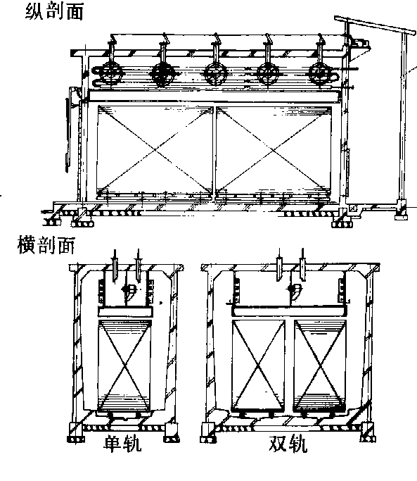 上部风机式干燥窑图 上部风机式横轴型 由“假天棚”分成风机间和干燥间。每台轴流风机单独横向安装,每台风机配一台电机,从而消除了长轴易发生故障的缺点,并提高了气流循环效果和干燥均匀性。但因风机间在上部,安装和维修不方便。 侧面风机式 风机和加热器布置在窑的侧边。风机直径接近于材堆的高度,气流横向水平循环(每循环一次通过材堆两次)。该窑型安装维修方便,但需要较大直径的风机,使材堆高度受到限制。 侧下风机式 风机装在窑的一侧下方,气流在材堆上半部和下半部横向循环。与侧面风机式的不同之处是风机直径只接近材堆高度的一半,结构较为简单,安装、维修及操作方便,是中、小型企业应用较普遍的窑型之一。 端部风机式斜壁型 风机装在窑后端部的风机间,气流横向水平循环。为了合理分配气流,干燥间两侧壁自后(或中)至前逐渐向内倾斜。该窑型结构简单,安装及维修方便,是比较好的窑型,适用于中、小型企业。 喷气式 窑内上部装有配气道和喷嘴组成的喷气装置。由配气道后端的轴流风机或装在窑外经吸气管和压气管与窑内联通的离心风机将干燥介质压入喷气装置,喷射气流实现强制循环。这种窑结构复杂,往往因喷气装置的制造与安装不精确而使干燥效果很差,现已较少采用。 干燥窑的选用和设计应根据各种窑型特点,结合被干木料的树种、规格、数量、干燥质量要求及自然条件等决定。干燥窑应具有足够的加热能力和气流循环速度,并有良好的保温、气密和耐腐蚀性能及必要的监测装置。窑内温度场和气流速度场应分布均匀,操作应方便、灵活、可靠。 木材干燥窑wood drying kiln用于木材干燥的特制建筑物或金属容器。内部设置通风、加热、调温及调湿等设备,用以控制干燥介质的温度、湿度及气流速度。在干燥窑内可以人为地控制木材的终含水率。木材干燥窑的种类较多,常见的有周期式强制循环干燥窑、连续式强制循环干燥窑、周期式自然循环干燥窑等。 |