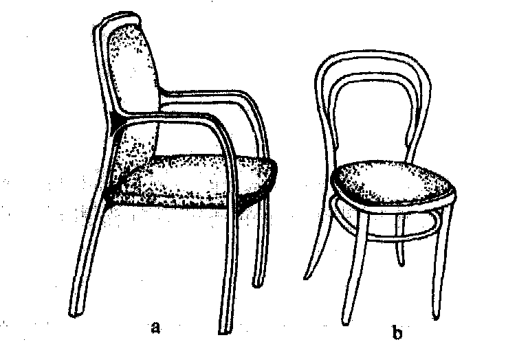 图1 弯曲椅子 木材弯曲方法 分为方材弯曲、薄板弯曲胶合、锯口弯曲胶合和人造板弯曲。 方材弯曲 将方材软化处理后,在弯曲力矩作用下弯曲成所要求的曲线形并使其干燥定型的过程。 方材弯曲原理 木材弯曲时,在凸面产生拉伸应力,凹面产生压缩应力,中间一层既不受拉伸也不受压缩称为中性层。气干材在常温条件下,纤维方向最大的拉伸应变值约为2%,压缩应变值约4%以上。在高温高含水率的条件下,木材拉伸应变值不变,而压缩应变值明显增大,并随树种和处理条件不同而异,山毛榉、榆木等硬阔叶树材可达25~30%。当木材的拉伸面紧贴两端有挡块的钢带,将木材与钢带作为一个整体进行弯曲时,因为中性层转移到拉伸区,由钢带承受拉伸力,木材只是在压缩力的作用下进行弯曲,故可以将木材弯曲成较小的弯曲半径。木材的弯曲性能通常用h/R表示。一定厚度的木材能弯曲的半径越小,说明其弯曲性能越好。弯曲性能h/R=ε1+ε2/1-ε2,h为方材厚度,R为模具半径,ε1、ε2分别为该木材的许用拉伸和压缩应变值。弯曲性能良好的树种有山毛榉、水曲柳、榆木、白栎、白蜡、山核桃、桑木等。针叶树材和软阔叶树材的弯曲性能较差。幼龄材、边材比老龄材、心材的弯曲性能好。 方材弯曲工艺 包括毛料选择、软化处理、加压弯曲和干燥定型。 ❶毛料选择 配制毛料时应选用具有良好弯曲性能的树种,纹理要通直,不允许有腐朽、斜纹、夹皮、节疤等缺陷。毛料含水率以25~30%为宜,过高或过低都会影响弯曲质量和成本。为保证弯曲时钢带紧贴方材的凸面,在弯曲前应刨光木材表面。 ❷软化处理 目的是改善木材的弯曲性能。处理方法有水热处理(蒸煮),高频、微波加热处理,化学药剂处理。水热处理用蒸煮锅或煮沸槽进行。处理温度通常为110~140℃。高频、微波加热能使毛料在几分钟内达到加热软化要求,它适用于高含水率的毛料。化学药剂处理分氨塑化、尿素塑化和碱液处理法,而氨塑化法又包括无水液氨(-33℃)、气体氨和氨水处理3种。水热处理软化法成本低、操作简便,在实际生产中应用最普遍。 ❸加压弯曲 采用两端设有端面挡块的钢带和模具进行。钢带厚0.2~2.5毫米。通常硬阔叶树材弯曲时端面压力为2~3兆帕。形状复杂的零件或生产数量少时常用手工弯曲(图2), 成批生产时,常用U型曲木机(图3)、环形曲木机(图4)或成型模热压法。 ❹干燥定型 毛料在弯曲后如立即解除压力,就会在弹性恢复下伸直。因此已弯曲毛料必须在弯曲状