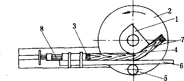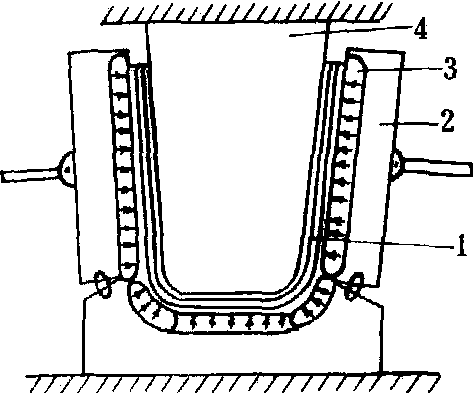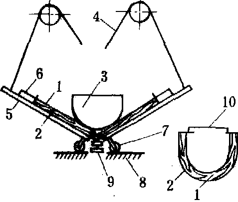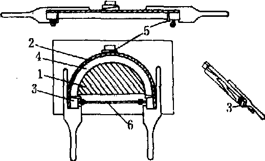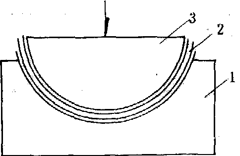 图5 一副硬模加压 弯曲胶合定型用模具和加压设备进行。按弯曲胶合加压方式分为用一副硬模加压(图5)和用硬模与软模(钢带、橡皮袋或软管)组合加压(图6)。按模具构成可分为整体模和分段加压模。模具可以是木质的或金属的。硬模结构简单,加压方便,寿命较长,缺点是加压不均。软模加压时压力大小易调节,各部位压力较均匀。木质模具常用于高频介质加热、低电压加热和小批量多品种生产,它的成本低,易制造,但使用期较短,易变形,需及时修正。金属模用铝合金或钢制成,适于蒸汽加热,产品形状精度较高,模具使用期长,宜大批量生产。加压设备为单向或多向压机,呈立式或卧式, 以立式居多。封闭形弯曲部件如椅座圈、桌子望板等可用连续卷缠法或内外模加压法。弯曲胶合时对板坯所加压力除用于弯曲板坯外,还用于克服单板层之间的摩擦力和厚度方向的压缩。压力的方向原则上要垂直板坯表面,要防止由于受力不当引起板坯在模具内位移,所以往往根据弯曲件形状设计成分段模,多向加压。应通过计算确定板坯在压模中的合理位置。胶合后的板坯要待胶固化后才能卸模。卸模后的弯曲件必须陈放一段时间,以求部件内的含水率均匀,内应力平衡,这样加工好的弯曲零件才能保证一定的形状、尺寸精度。