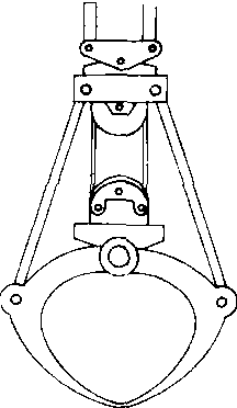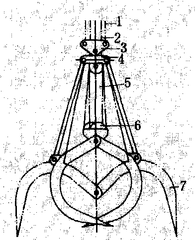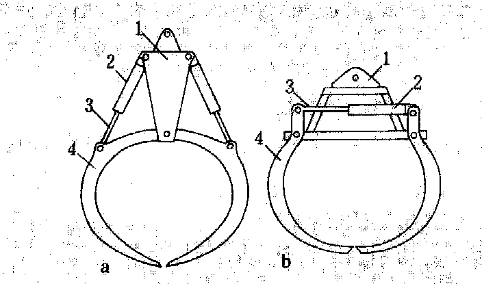 图1 索式木材径向抓具 机械式木材径向抓具 有电动葫芦式、电动卷筒式和电动螺杆式等数种,特点是抓爪的闭合机构放置在抓具上,并可安装抓具的回转机构。由于抓爪在闭合时不像索式抓具那样受到闭合索向上的拉力,在相同功率条件下,其抓取能力较大。电动葫芦式木材径向抓具采用标准的电动葫芦作为抓爪的闭合动力。有的还在抓爪上安装振动器,以减轻抓爪进入木材空隙的阻力。振动器由电动机和曲轴等零部件组成。闭合机构的电动机功率为7~16千瓦时,滑轮组的倍率为4~6。这种抓具优点是构造简单,制造容易,缺点是电动葫芦易发生故障,界限尺寸和自重较大。电动卷筒式木材径向抓具是由电动机、减速装置、制动装置与卷筒等组成。工作可靠,不易发生故障,但界限尺寸和自重较大。电动螺杆式木材径向抓具分为中央螺杆式和侧螺杆式两种。前者高度界限尺寸大、工作不够稳定。后者的侧螺杆起撑杆作用,通过电动机、锥形齿轮减速装置驱动旋转,使抓爪上的铰接螺母沿螺杆上下移动来实现抓爪的开闭。它的界限尺寸小、自重轻、抓取性能好、工作可靠。 液压式木材径向抓具 由框架、抓爪和开闭油缸等组成(图2)。抓爪的开闭机构(电动机、油泵、油箱和控制设备等液压传动系统)安装在框架内。抓爪的开闭靠双向作用的油缸来实现。油缸的布置分竖缸、斜缸和卧缸3种型式。后两种型式具有抓取能力大、高度界限尺寸小、重量轻、功率大和工作平稳等优点,应用广泛。但液压元件的制造工艺要求较高,林区维修不方便。 ![]() 图2 液压式木材径向抓具 木材端向抓具 由框架、两个侧抓板和电动机械传动或液压传动系统组成。两侧抓板上带有很多刺钉,每个刺钉内装有压缩弹簧,迫使刺钉伸出板面。抓具吊挂在装卸机械上,抓板以张开状态放在木堆上,使木堆中一部分木材处于两板之间,开动闭合电机,两抓板向内收拢,木材端面被刺钉压入而夹住。这种抓具具有能使原木自动齐头、抓取迅速的特点,但抓具笨重,只适于中短原木和方材的归楞和装车作业。主要在苏联得到应用。 技术参数 有自重、抓取量、抓腔面积、界限尺寸、抓爪开度和抓爪闭合时间数项。原木归楞和装车抓具自重一般为1.8~2.4吨,原条卸车抓具自重一般为3.5~4.5吨。抓取量和抓腔面积根据装卸机械的起重量和作业条件确定,抓腔的面积最好是可变的。抓爪闭合速度通常小于0.25米/秒,抓爪闭合时间在原木抓具中一般为10~25秒。原木抓具的闭合电机功率一般为7~16千瓦。抓爪爪形一般为近圆形或椭圆形,爪端有30~50厘米长的直线段,闭合后爪端切线与水平线的夹角一般为15°~20°。抓爪在最大开度状态下,爪端与水平线夹角常为95°~105°。 木材抓具log grab又称原木抓具。依靠抓爪开闭,自动卸出和抓取原木的取物装置。常用木材抓具有3种: