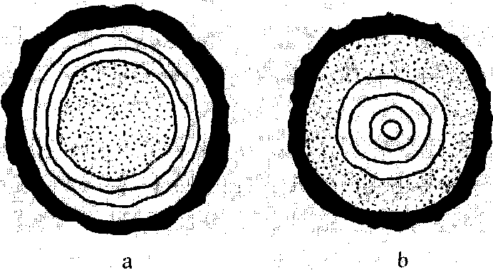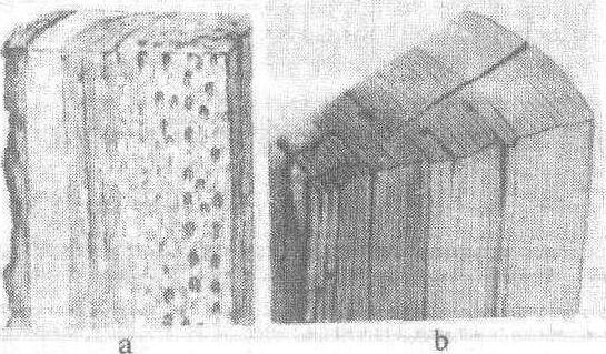 图1 心、边材腐朽示意a.心材腐朽; b.边材腐朽 白腐 主要由白腐菌破坏木质素,同时也破坏纤维素所形成。受害木材多呈白色或淡黄白色,或浅红褐色,露出纤维状结构。外观似大理石状者,称大理石状腐朽;似海绵状者,称海绵状腐朽;似蜂窝状者,称筛孔状腐朽(图2a)。白腐后期材质松软,容易剥落。 褐腐 主要由褐腐菌破坏纤维素所形成。外观呈红褐色或棕褐色,质脆,中间有纵横交错的块状裂隙。褐腐后期受害木材易捻成粉末,故又称为粉末状腐朽(图2 b)。褐腐在危害用材特别是危害建筑结构材中常分为干腐和湿腐两类。❶干腐:由于干腐菌的侵害所致。该菌菌丝能输导水分使位于通风不良的干材变潮而遭受侵害,形成典型的红褐色块状腐朽,是木建筑构件的重要腐朽类型。 ❷湿腐:多由粉孢革菌等的侵害所形成。受害木材多处于潮湿条件下,如在建筑物内有漏水或凝结水的木构件部位,常引起木材呈红褐色块状,且多为纵裂腐朽。其次亦见于矿柱、桥梁、仓库、枕木等处的湿木材。也有时见于贮木场的原木等。