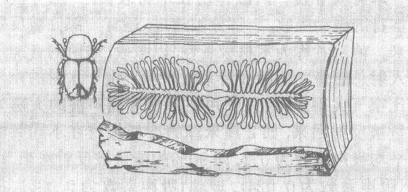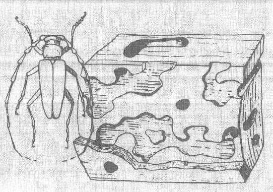 图4 由天牛危害形成的大虫眼 一般表面的虫眼和虫沟可随板皮一起锯除,故对木材的利用基本没有影响,分散的小虫眼影响也不大。但蛀蚀较深的大虫眼和深而密集的小虫眼,常能破坏木材的完整性和纤维的连续度,并降低力学强度。所有虫眼都给变色菌和腐朽菌带来了传播和繁殖的有利条件。 髓斑 系立木在生长时期形成层受到昆虫的侵害,愈合后所形成。在某些树种的横断面上常见到色泽较深的半圆或半月形的斑点,其长径在弦向约为0.16~0.32厘米。大量存在时会影响木材强度。髓斑常见于桦木、槭木、椴木、柳木、樱桃木等树种。导致髓斑形成的昆虫主要有双翅目。例如桦木的髓斑主要由蝇类幼虫侵入所致。 木材在使用期间的虫害缺陷 锯材、建筑结构用材、家具材等常遭受鞘翅目的蠹科、长蠹科、粉蠹科和天牛科,等翅目的鼻白蚁科、木白蚁科和白蚁科,以及膜翅目的木蚁等害虫的侵害。所造成的缺陷可分为针孔粉柱状缺陷、大孔粉柱状缺陷和蜂窝状缺陷3类。 针孔粉柱状缺陷 主要由粉柱甲虫如窃蠹科、长蠹科、粉蠹科等科的害虫侵害所形成。虫道都被细的蛀屑所填塞。幼虫在木材中纵横不规则地钻蛀,木材表层呈现许多细孔,孔径0.8~1.5或2.1毫米,危害严重时,木材仅外壳保持完整,而内部则呈粉柱状破坏。粉蠹科的甲虫多侵害硬阔叶树材如栎木、白蜡、山核桃等的导管。木材受害程度,视其淀粉含量而定。窃蠹科的甲虫如家具窃蠹多危害阔叶树材和针叶树材的边材及一些淡色的阔叶树材心材,常见于干燥的木建筑物和木器家具等木制品。长蠹科的甲虫既危害干燥的木材,也伤害刚伐下的新鲜阔叶树材,特别是带皮的阔叶树材。其成虫在树皮中筑起无蛀屑的虫道,产卵,卵孵化成幼虫后,即在边材上钻食淀粉食物,并将虫道用细的蛀屑填塞住,虫道圆柱形。被害木材常仅留一层纸样外壳。 大孔眼粉柱状缺陷 主要由天牛科的某些天牛侵害所形成。木材表层可以见到蛀孔或虫眼,木材内部则充满粉柱状的蛀屑,破坏严重时不堪使用。在中国危害木材的有家天牛和长角凿点天牛。❶家天牛:又名腐木天牛。常侵害气干状态的原木,特别是针叶树材制成的建筑物构件和电线杆等。卵产在缝隙内,幼虫咬蛀成不规则的坑道,坑道伸向各方,但主要与纤维并行。幼虫的虫眼较大,直径6~8毫米。深入边材内部,断面呈椭圆形,坑道均充满细的蛀屑。幼虫完成其发育后,即转向表层在其稍下方筑蛹室,用细的蛀屑堵住蛹室化蛹。经羽化后的成虫,即从咬蛀成直径为0.5~1.0厘米的卵形孔中飞出。确定木材的受害程度时,要用小锤敲打,凭借声音来判断。同时,敲打受害木时,会有白色微细的粉末蛀屑从缝隙内震出。 ❷长角凿点天牛:又称长角栎天牛。分布在中国山东、广东、台湾等地。主要危害房屋建筑和家具木材。被害树种很多,多是阔叶树材的边材。成虫卵产在细小的缝隙或小虫孔中,深约5~7毫米。幼虫孵出后,即蛀入木材以淀粉和可溶性糖类为食,外面无任何痕迹。幼虫坑道极不规则,坑道内充满粉状蛀屑。坑道深度可达20~24毫米,直径7~10毫米。老熟幼虫在坑道末端筑室化蛹,新成虫常穿凿椭圆形羽化孔钻出。 蜂窝状缺陷 这类缺陷主要由等翅目的白蚁和膜翅目的木蚁等的侵害所形成。❶白蚁:是危害使用期内木材的最主要害虫。这类昆虫在温暖潮湿地区特别是在中国南方地区最为猖獗;能侵害房屋建筑、枕木、电杆、柱材、桩木、矿柱、桥梁等用材。木材内部常形成蜂窝状或片状的破坏。白蚁为群居性昆虫,其破坏活动非常隐蔽,不易被发现,即使木材内部完全蛀空,其外面表层仍很完整。根据白蚁的栖居习性和营巢位置,可分为木栖、土木栖和土栖3类。木栖类的堆砂白蚁型,属木白蚁科,完全生活在木材中,与土壤不发生关系,主要危害房屋建筑构件或衰弱的活立木。土木栖类又可分为家白蚁和散白蚁两个不同的巢居类型。家白蚁型,属鼻白蚁科。在室内或野外筑巢,常见于大树干内,专蛀蚀早材,是中国长江以南地区房屋建筑物的大敌。散白蚁型,不筑大型巨巢,群体多分散,多危害立木根部或近地面树干,房屋构件也常受其害。土栖白蚁类,属白蚁科,筑巢于地下,深达1~2米,是河堤、水库的大敌,也蛀蚀木材。 ❷木蚁:大的和小的黑色或褐色木蚁常危害根株、陈旧原木和衰弱的立木。亦能危害使用的木材,如建筑材和电杆等,尤其是已发生腐朽并开始软化的木材。不如白蚁那样隐蔽,在被害木附近常可见到。 海生钻孔动物危害缺陷 浸在海水中的桩木、护木、渔船和其他木结构,常受到海生钻孔动物的蛀蚀,形成蜂窝状的缺陷。这些动物主要有软体动物的船蛆和海笋、甲壳动物的蛀木水虱和团水虱等。(见海生钻孔动物危害) 木材伐倒以后,因生物危害所产生的缺陷多数可以控制。一方面根据木材不同的用途所容许的缺陷限度,合理利用木材,或改进加工工艺。同时也可改善贮存期间的木材保管技术和加强用材的防腐、防虫处理,严格限制生物对木材的侵害。 木材生物危害缺陷defects of wood due to biological damage木材由于受到真菌、细菌、昆虫、海生钻孔动物等侵害而形成的变色、腐朽、虫眼或蛀孔等缺陷。常见的变色为蓝变。腐朽根据其形态和色泽,可分为白腐、褐腐和软腐3种类型。木材使用前的虫害缺陷主要有虫眼(又分表面虫眼或虫沟、小虫眼、大虫眼)和髓斑;在使用